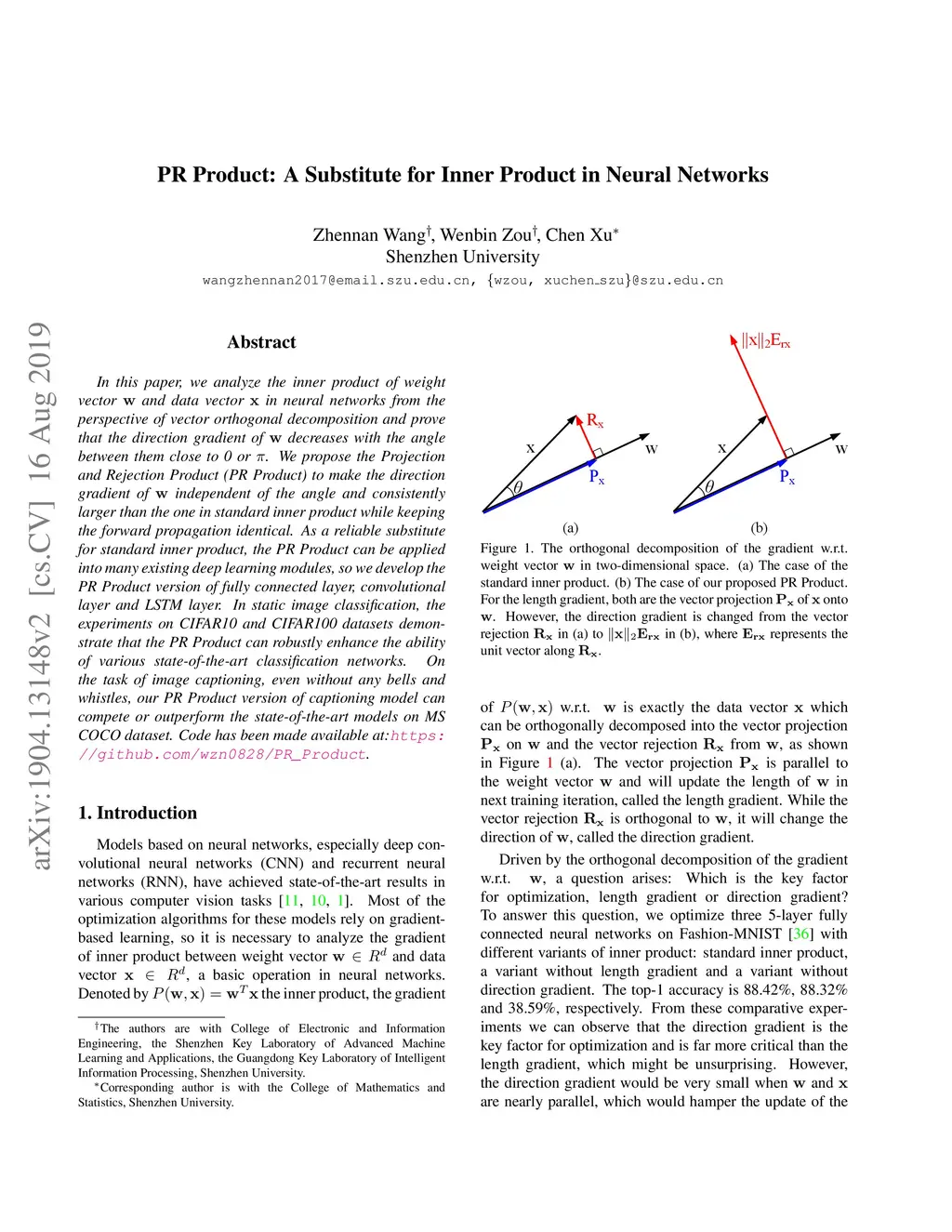 In this paper, we analyze the inner product of weight vector w and data vector x in neural networks from the perspective of vector orthogonal decomposition and prove that the direction gradient of w decreases with the angle between them close to 0 or {\pi}. We propose the Projection and Rejection Product (PR Product) to make the direction gradient of w independent of the angle and consistently larger than the one in standard inner product while keeping the forward propagation identical. As a reliable substitute for standard inner product, the PR Product can be applied into many existing deep learning modules, so we develop the PR Product version of fully connected layer, convolutional layer and LSTM layer. In static image classification, the experiments on CIFAR10 and CIFAR100 datasets demonstrate that the PR Product can robustly enhance the ability of various state-of-the-art classification networks. On the task of image captioning, even without any bells and whistles, our PR Product version of captioning model can compete or outperform the state-of-the-art models on MS COCO dataset. Code has been made available at:https://github.com/wzn0828/PR_Product.