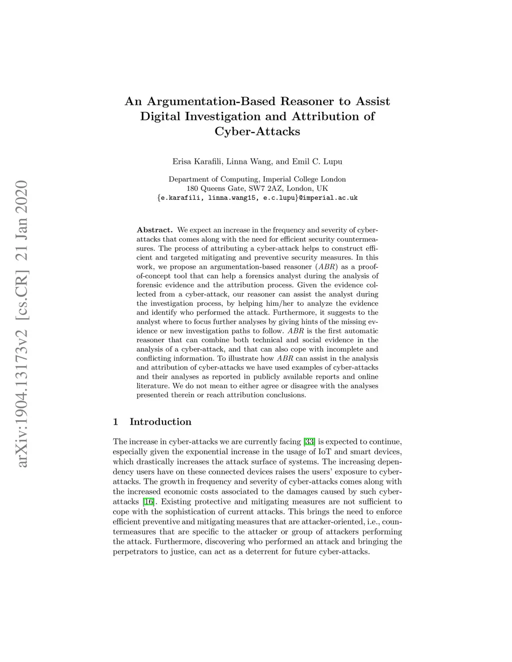 We expect an increase in the frequency and severity of cyber-attacks that comes along with the need for efficient security countermeasures. The process of attributing a cyber-attack helps to construct efficient and targeted mitigating and preventive security measures. In this work, we propose an argumentation-based reasoner (ABR) as a proof-of-concept tool that can help a forensics analyst during the analysis of forensic evidence and the attribution process. Given the evidence collected from a cyber-attack, our reasoner can assist the analyst during the investigation process, by helping him/her to analyze the evidence and identify who performed the attack. Furthermore, it suggests to the analyst where to focus further analyses by giving hints of the missing evidence or new investigation paths to follow. ABR is the first automatic reasoner that can combine both technical and social evidence in the analysis of a cyber-attack, and that can also cope with incomplete and conflicting information. To illustrate how ABR can assist in the analysis and attribution of cyber-attacks we have used examples of cyber-attacks and their analyses as reported in publicly available reports and online literature. We do not mean to either agree or disagree with the analyses presented therein or reach attribution conclusions.
