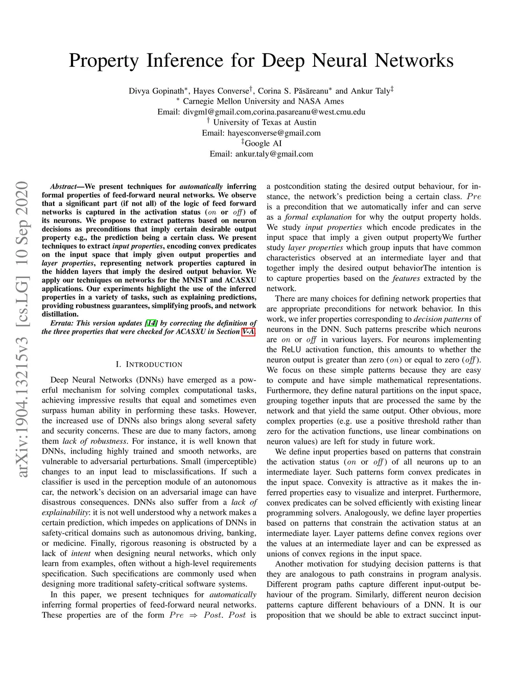 We present techniques for automatically inferring formal properties of feed-forward neural networks. We observe that a significant part (if not all) of the logic of feed forward networks is captured in the activation status (ón' or óff') of its neurons. We propose to extract patterns based on neuron decisions as preconditions that imply certain desirable output property e.g., the prediction being a certain class. We present techniques to extract input properties, encoding convex predicates on the input space that imply given output properties and layer properties, representing network properties captured in the hidden layers that imply the desired output behavior. We apply our techniques on networks for the MNIST and ACASXU applications. Our experiments highlight the use of the inferred properties in a variety of tasks, such as explaining predictions, providing robustness guarantees, simplifying proofs, and network distillation.