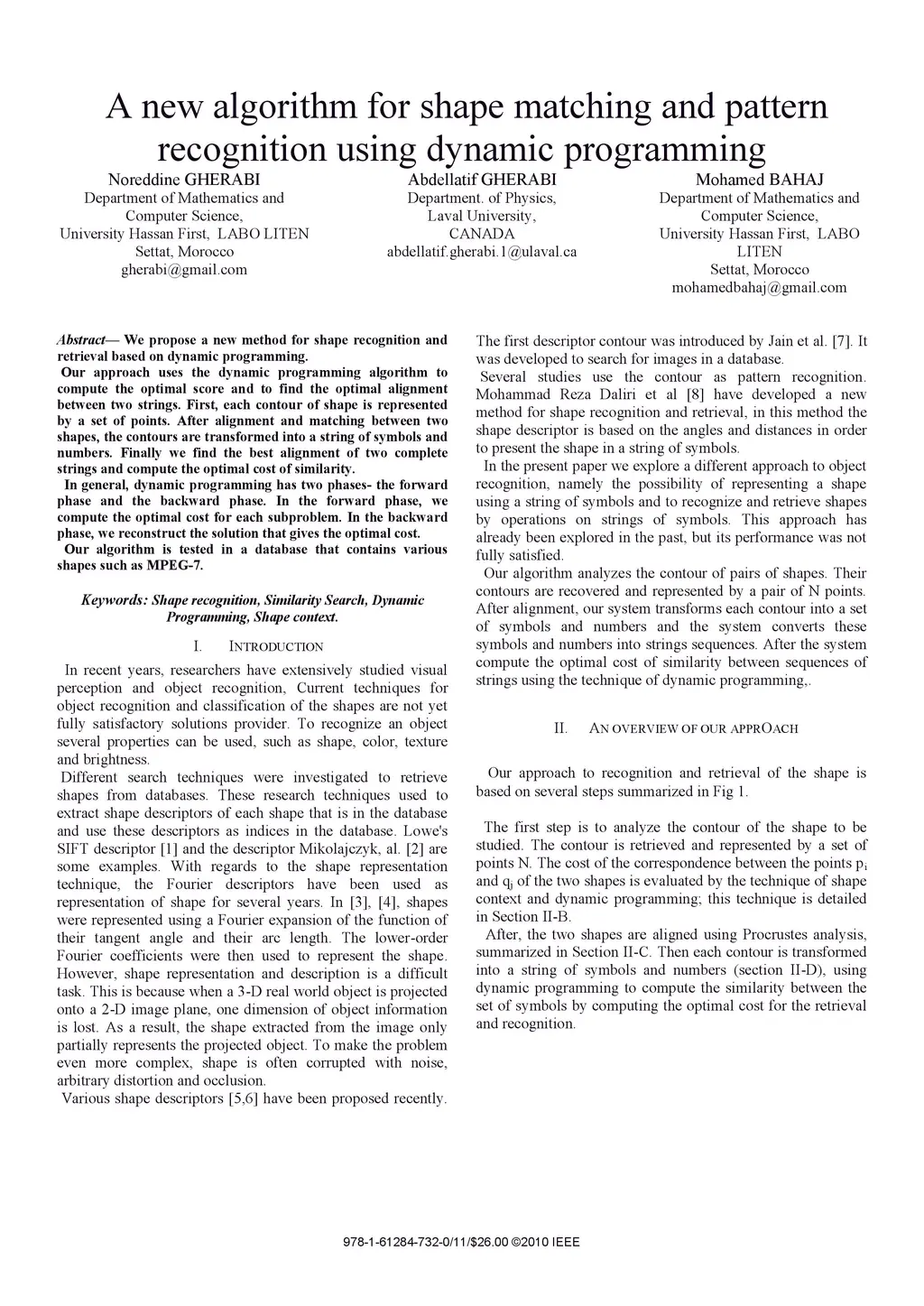 We propose a new method for shape recognition and retrieval based on dynamic programming. Our approach uses the dynamic programming algorithm to compute the optimal score and to find the optimal alignment between two strings. First, each contour of shape is represented by a set of points. After alignment and matching between two shapes, the contours are transformed into a string of symbols and numbers. Finally we find the best alignment of two complete strings and compute the optimal cost of similarity. In general, dynamic programming has two phases: the forward phase and the backward phase. In the forward phase, we compute the optimal cost for each subproblem. In the backward phase, we reconstruct the solution that gives the optimal cost. Our algorithm is tested in a database that contains various shapes such as MPEG-7.