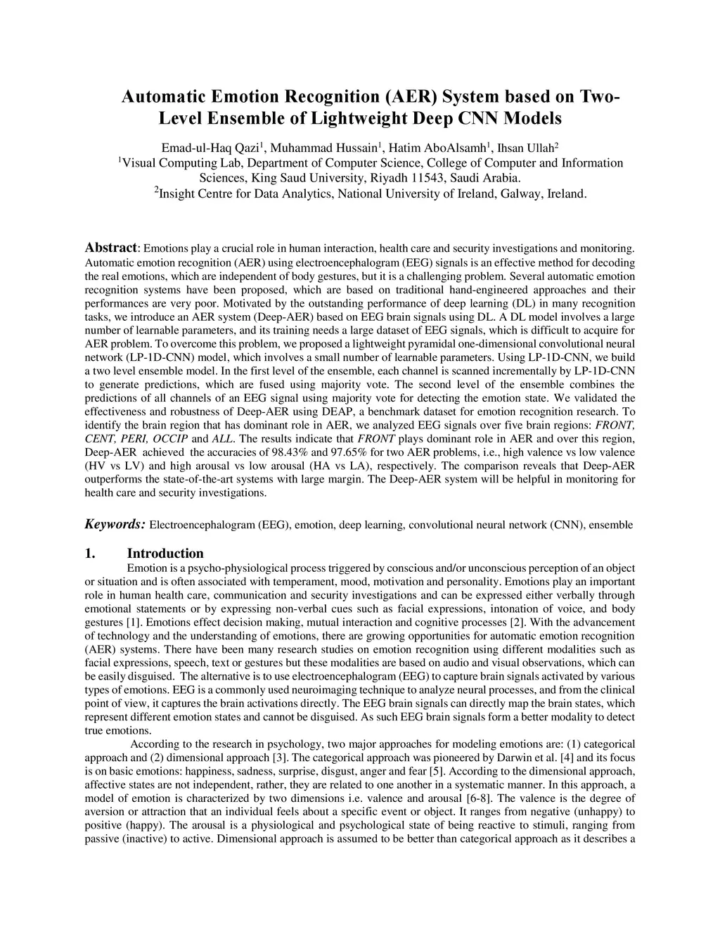 Emotions play a crucial role in human interaction, health care and security investigations and monitoring. Automatic emotion recognition (AER) using electroencephalogram (EEG) signals is an effective method for decoding the real emotions, which are independent of body gestures, but it is a challenging problem. Several automatic emotion recognition systems have been proposed, which are based on traditional hand-engineered approaches and their performances are very poor. Motivated by the outstanding performance of deep learning (DL) in many recognition tasks, we introduce an AER system (Deep-AER) based on EEG brain signals using DL. A DL model involves a large number of learnable parameters, and its training needs a large dataset of EEG signals, which is difficult to acquire for AER problem. To overcome this problem, we proposed a lightweight pyramidal one-dimensional convolutional neural network (LP-1D-CNN) model, which involves a small number of learnable parameters. Using LP-1D-CNN, we build a two level ensemble model. In the first level of the ensemble, each channel is scanned incrementally by LP-1D-CNN to generate predictions, which are fused using majority vote. The second level of the ensemble combines the predictions of all channels of an EEG signal using majority vote for detecting the emotion state. We validated the effectiveness and robustness of Deep-AER using DEAP, a benchmark dataset for emotion recognition research. The results indicate that FRONT plays dominant role in AER and over this region, Deep-AER achieved the accuracies of 98.43% and 97.65% for two AER problems, i.e., high valence vs low valence (HV vs LV) and high arousal vs low arousal (HA vs LA), respectively. The comparison reveals that Deep-AER outperforms the state-of-the-art systems with large margin. The Deep-AER system will be helpful in monitoring for health care and security investigations.