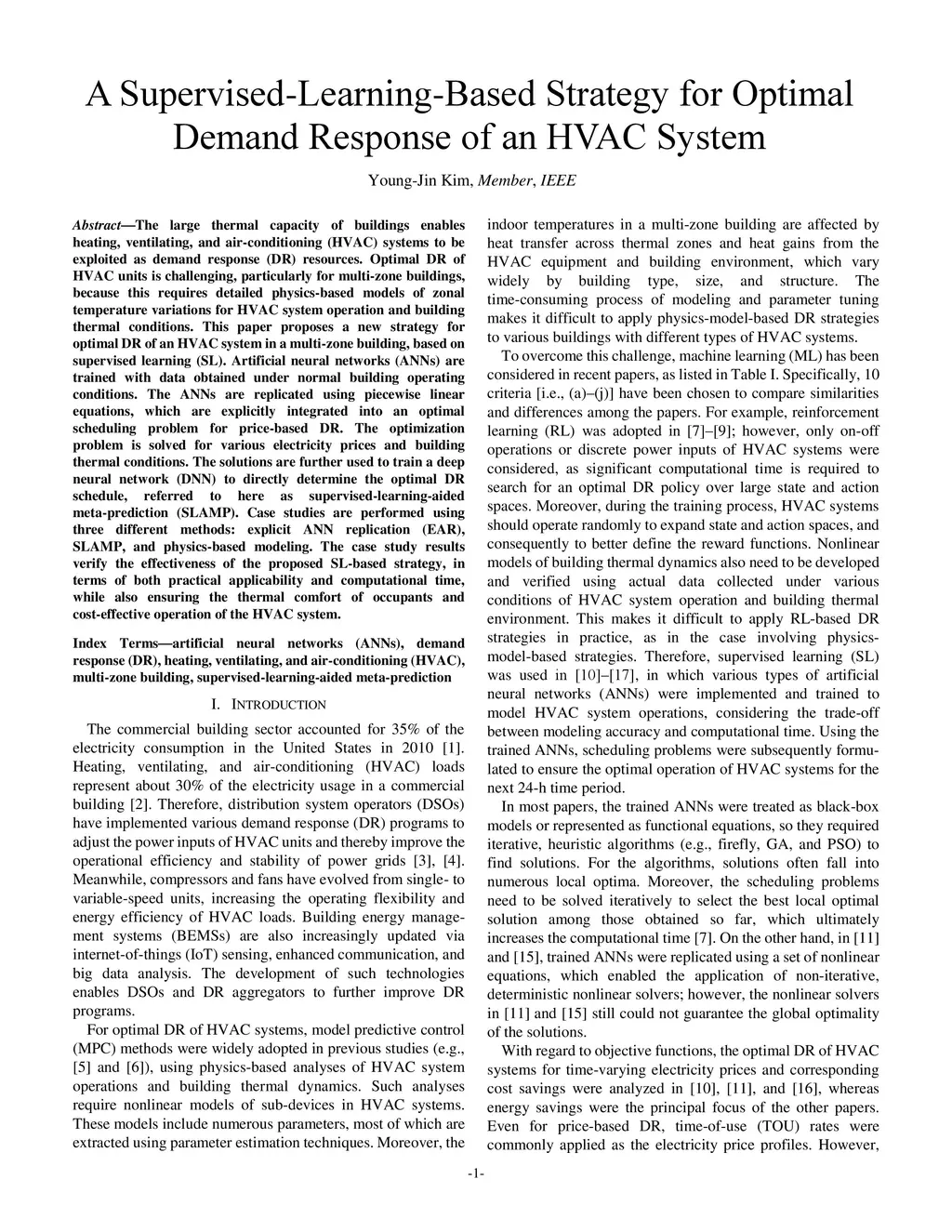 The large thermal capacity of buildings enables heating, ventilating, and air-conditioning (HVAC) systems to be exploited as demand response (DR) resources. Optimal DR of HVAC units is challenging, particularly for multi-zone buildings, because this requires detailed physics-based models of zonal temperature variations for HVAC system operation and building thermal conditions. This paper proposes a new strategy for optimal DR of an HVAC system in a multi-zone building, based on supervised learning (SL). Artificial neural networks (ANNs) are trained with data obtained under normal building operating conditions. The ANNs are replicated using piecewise linear equations, which are explicitly integrated into an optimal scheduling problem for price-based DR. The optimization problem is solved for various electricity prices and building thermal conditions. The solutions are further used to train a deep neural network (DNN) to directly determine the optimal DR schedule, referred to here as supervised-learning-aided meta-prediction (SLAMP). Case studies are performed using three different methods: explicit ANN replication (EAR), SLAMP, and physics-based modeling. The case study results verify the effectiveness of the proposed SL-based strategy, in terms of both practical applicability and computational time, while also ensuring the thermal comfort of occupants and cost-effective operation of the HVAC system.