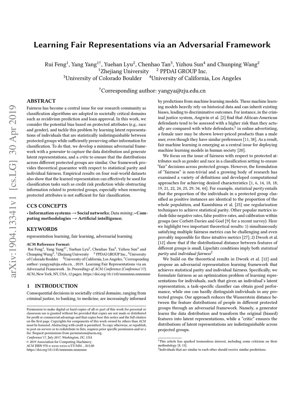 Fairness has become a central issue for our research community as classification algorithms are adopted in societally critical domains such as recidivism prediction and loan approval. In this work, we consider the potential bias based on protected attributes (e.g., race and gender), and tackle this problem by learning latent representations of individuals that are statistically indistinguishable between protected groups while sufficiently preserving other information for classification. To do that, we develop a minimax adversarial framework with a generator to capture the data distribution and generate latent representations, and a critic to ensure that the distributions across different protected groups are similar. Our framework provides a theoretical guarantee with respect to statistical parity and individual fairness. Empirical results on four real-world datasets also show that the learned representation can effectively be used for classification tasks such as credit risk prediction while obstructing information related to protected groups, especially when removing protected attributes is not sufficient for fair classification.