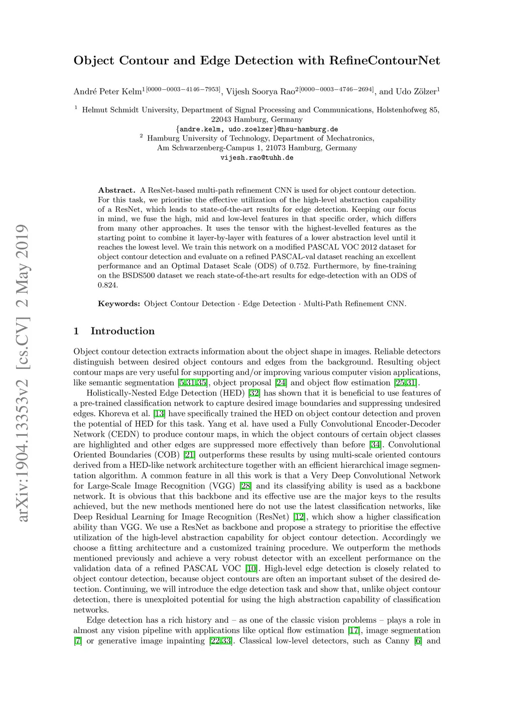 A ResNet-based multi-path refinement CNN is used for object contour detection. For this task, we prioritise the effective utilization of the high-level abstraction capability of a ResNet, which leads to state-of-the-art results for edge detection. Keeping our focus in mind, we fuse the high, mid and low-level features in that specific order, which differs from many other approaches. It uses the tensor with the highest-levelled features as the starting point to combine it layer-by-layer with features of a lower abstraction level until it reaches the lowest level. We train this network on a modified PASCAL VOC 2012 dataset for object contour detection and evaluate on a refined PASCAL-val dataset reaching an excellent performance and an Optimal Dataset Scale (ODS) of 0.752. Furthermore, by fine-training on the BSDS500 dataset we reach state-of-the-art results for edge-detection with an ODS of 0.824.