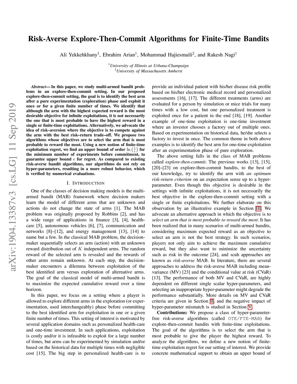 In this paper, we study multi-armed bandit problems in explore-then-commit setting. In our proposed explore-then-commit setting, the goal is to identify the best arm after a pure experimentation (exploration) phase and exploit it once or for a given finite number of times. We identify that although the arm with the highest expected reward is the most desirable objective for infinite exploitations, it is not necessarily the one that is most probable to have the highest reward in a single or finite-time exploitations. Alternatively, we advocate the idea of risk-aversion where the objective is to compete against the arm with the best risk-return trade-off. Then, we propose two algorithms whose objectives are to select the arm that is most probable to reward the most. Using a new notion of finite-time exploitation regret, we find an upper bound for the minimum number of experiments before commitment, to guarantee an upper bound for the regret. As compared to existing risk-averse bandit algorithms, our algorithms do not rely on hyper-parameters, resulting in a more robust behavior in practice, which is verified by the numerical evaluation.