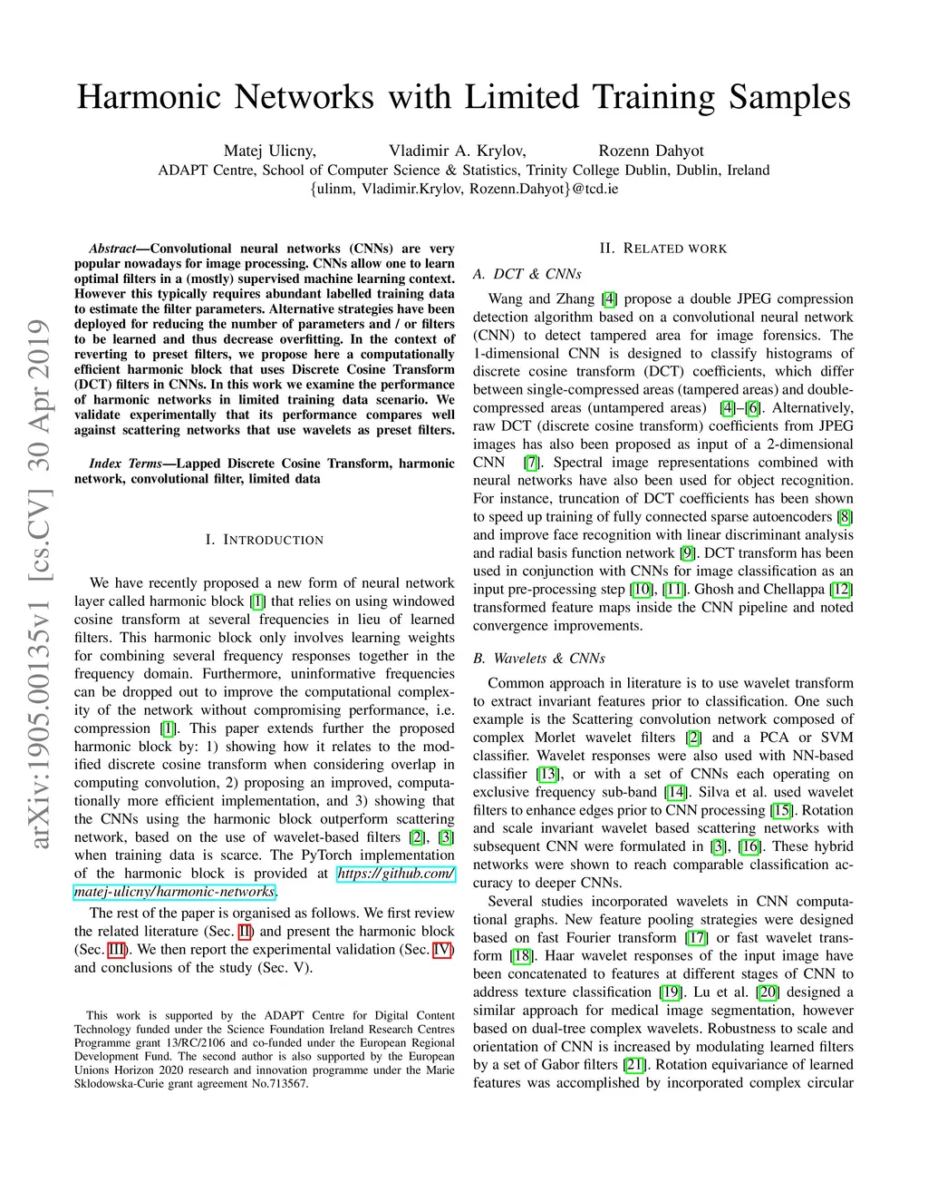 Convolutional neural networks (CNNs) are very popular nowadays for image processing. CNNs allow one to learn optimal filters in a (mostly) supervised machine learning context. However this typically requires abundant labelled training data to estimate the filter parameters. Alternative strategies have been deployed for reducing the number of parameters and / or filters to be learned and thus decrease overfitting. In the context of reverting to preset filters, we propose here a computationally efficient harmonic block that uses Discrete Cosine Transform (DCT) filters in CNNs. In this work we examine the performance of harmonic networks in limited training data scenario. We validate experimentally that its performance compares well against scattering networks that use wavelets as preset filters.