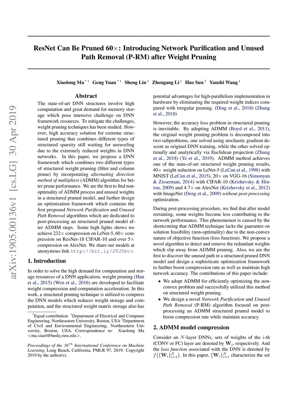 The state-of-art DNN structures involve high computation and great demand for memory storage which pose intensive challenge on DNN framework resources. To mitigate the challenges, weight pruning techniques has been studied. However, high accuracy solution for extreme structured pruning that combines different types of structured sparsity still waiting for unraveling due to the extremely reduced weights in DNN networks. In this paper, we propose a DNN framework which combines two different types of structured weight pruning (filter and column prune) by incorporating alternating direction method of multipliers (ADMM) algorithm for better prune performance. We are the first to find non-optimality of ADMM process and unused weights in a structured pruned model, and further design an optimization framework which contains the first proposed Network Purification and Unused Path Removal algorithms which are dedicated to post-processing an structured pruned model after ADMM steps. Some high lights shows we achieve 232x compression on LeNet-5, 60x compression on ResNet-18 CIFAR-10 and over 5x compression on AlexNet. We share our models at anonymous link http://bit.ly/2VJ5ktv.