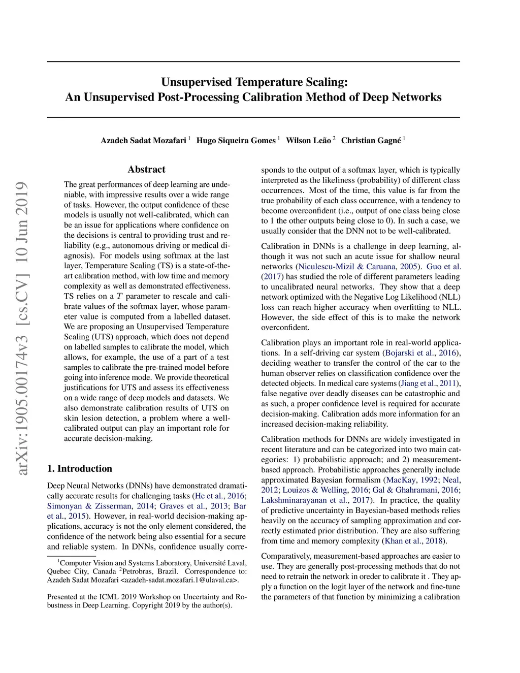 The great performances of deep learning are undeniable, with impressive results over a wide range of tasks. However, the output confidence of these models is usually not well-calibrated, which can be an issue for applications where confidence on the decisions is central to providing trust and reliability (e.g., autonomous driving or medical diagnosis). For models using softmax at the last layer, Temperature Scaling (TS) is a state-of-the-art calibration method, with low time and memory complexity as well as demonstrated effectiveness. TS relies on a T parameter to rescale and calibrate values of the softmax layer, whose parameter value is computed from a labelled dataset. We are proposing an Unsupervised Temperature Scaling (UTS) approach, which does not depend on labelled samples to calibrate the model, which allows, for example, the use of a part of a test samples to calibrate the pre-trained model before going into inference mode. We provide theoretical justifications for UTS and assess its effectiveness on a wide range of deep models and datasets. We also demonstrate calibration results of UTS on skin lesion detection, a problem where a well-calibrated output can play an important role for accurate decision-making.