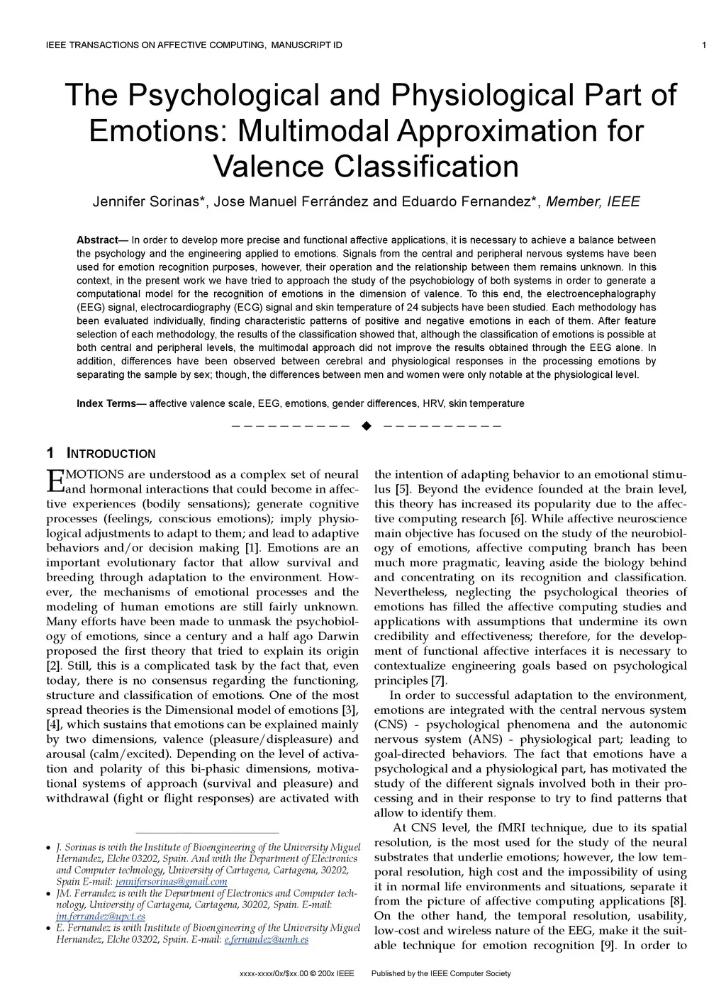In order to develop more precise and functional affective applications, it is necessary to achieve a balance between the psychology and the engineering applied to emotions. Signals from the central and peripheral nervous systems have been used for emotion recognition purposes, however, their operation and the relationship between them remains unknown. In this context, in the present work we have tried to approach the study of the psychobiology of both systems in order to generate a computational model for the recognition of emotions in the dimension of valence. To this end, the electroencephalography (EEG) signal, electrocardiography (ECG) signal and skin temperature of 24 subjects have been studied. Each methodology has been evaluated individually, finding characteristic patterns of positive and negative emotions in each of them. After feature selection of each methodology, the results of the classification showed that, although the classification of emotions is possible at both central and peripheral levels, the multimodal approach did not improve the results obtained through the EEG alone. In addition, differences have been observed between cerebral and physiological responses in the processing emotions by separating the sample by sex; though, the differences between men and women were only notable at the physiological level.
