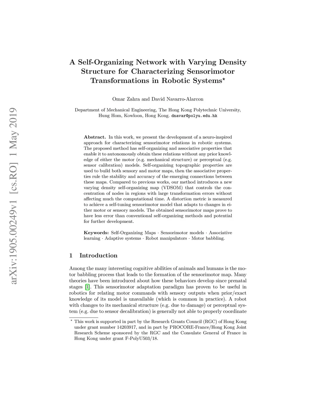 In this work, we present the development of a neuro-inspired approach for characterizing sensorimotor relations in robotic systems. The proposed method has self-organizing and associative properties that enable it to autonomously obtain these relations without any prior knowledge of either the motor (e.g. mechanical structure) or perceptual (e.g. sensor calibration) models. Self-organizing topographic properties are used to build both sensory and motor maps, then the associative properties rule the stability and accuracy of the emerging connections between these maps. Compared to previous works, our method introduces a new varying density self-organizing map (VDSOM) that controls the concentration of nodes in regions with large transformation errors without affecting much the computational time. A distortion metric is measured to achieve a self-tuning sensorimotor model that adapts to changes in either motor or sensory models. The obtained sensorimotor maps prove to have less error than conventional self-organizing methods and potential for further development.