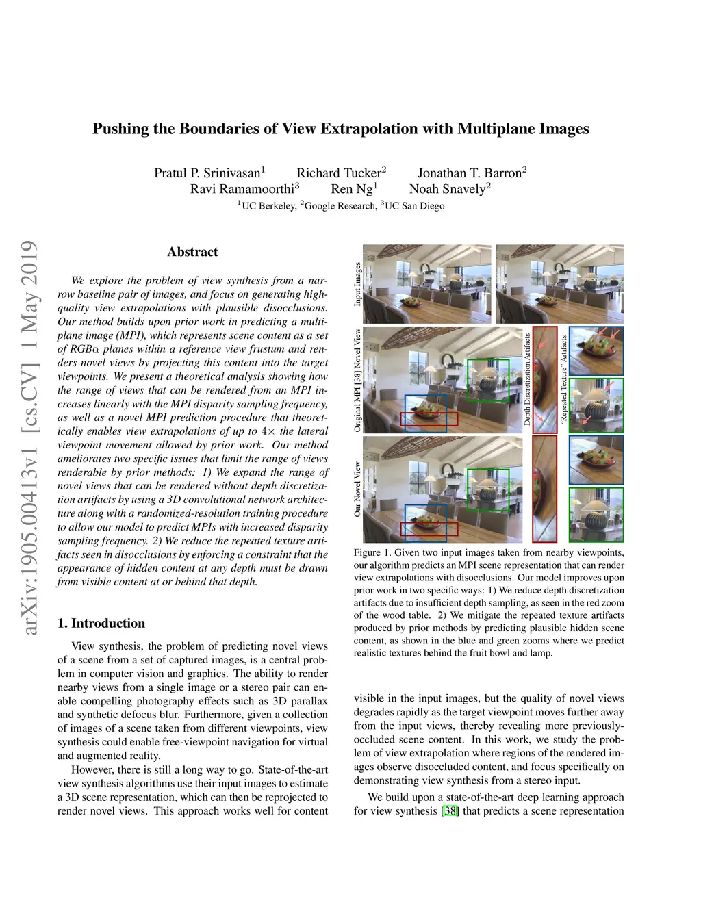 We explore the problem of view synthesis from a narrow baseline pair of images, and focus on generating high-quality view extrapolations with plausible disocclusions. Our method builds upon prior work in predicting a multiplane image (MPI), which represents scene content as a set of RGB planes within a reference view frustum and renders novel views by projecting this content into the target viewpoints. We present a theoretical analysis showing how the range of views that can be rendered from an MPI increases linearly with the MPI disparity sampling frequency, as well as a novel MPI prediction procedure that theoretically enables view extrapolations of up to the lateral viewpoint movement allowed by prior work. Our method ameliorates two specific issues that limit the range of views renderable by prior methods: 1) We expand the range of novel views that can be rendered without depth discretization artifacts by using a 3D convolutional network architecture along with a randomized-resolution training procedure to allow our model to predict MPIs with increased disparity sampling frequency. 2) We reduce the repeated texture artifacts seen in disocclusions by enforcing a constraint that the appearance of hidden content at any depth must be drawn from visible content at or behind that depth. Please see our results video at: https://www.youtube.com/watch?v=aJqAaMNL2m4.