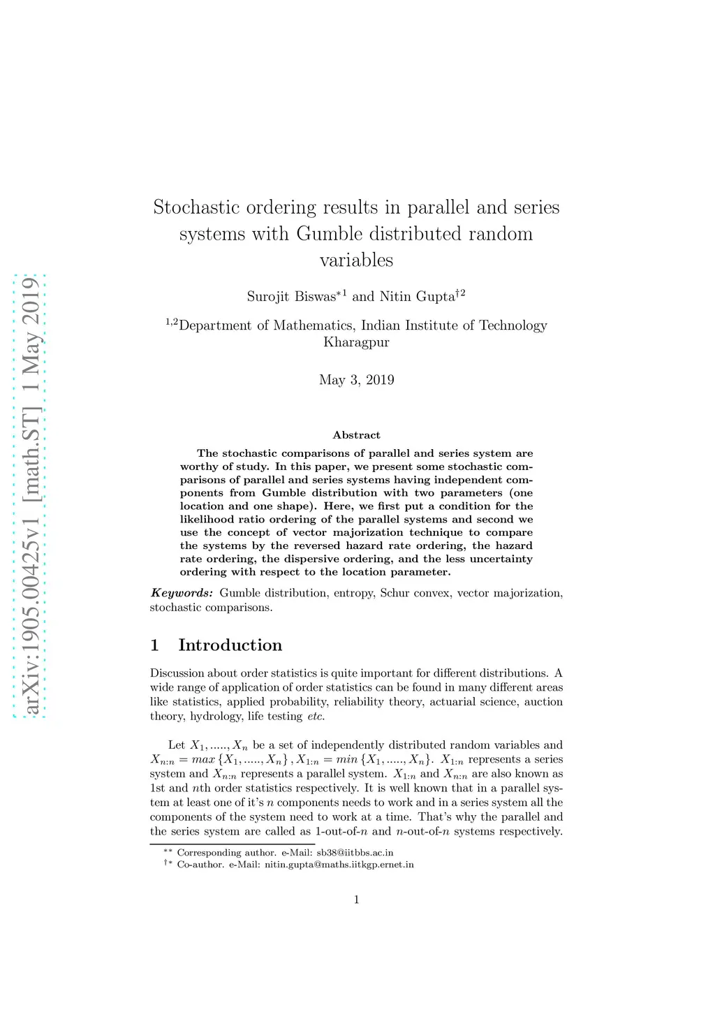 Stochastic ordering results in parallel and series systems with Gumble