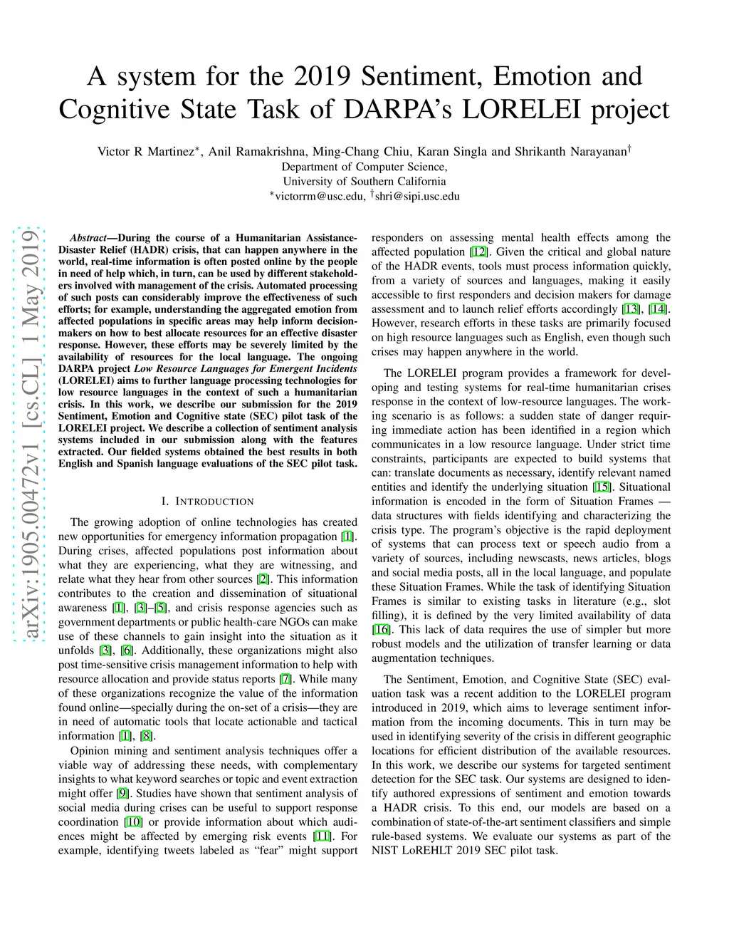 During the course of a Humanitarian Assistance-Disaster Relief (HADR) crisis, that can happen anywhere in the world, real-time information is often posted online by the people in need of help which, in turn, can be used by different stakeholders involved with management of the crisis. Automated processing of such posts can considerably improve the effectiveness of such efforts; for example, understanding the aggregated emotion from affected populations in specific areas may help inform decision-makers on how to best allocate resources for an effective disaster response. However, these efforts may be severely limited by the availability of resources for the local language. The ongoing DARPA project Low Resource Languages for Emergent Incidents (LORELEI) aims to further language processing technologies for low resource languages in the context of such a humanitarian crisis. In this work, we describe our submission for the 2019 Sentiment, Emotion and Cognitive state (SEC) pilot task of the LORELEI project. We describe a collection of sentiment analysis systems included in our submission along with the features extracted. Our fielded systems obtained the best results in both English and Spanish language evaluations of the SEC pilot task.