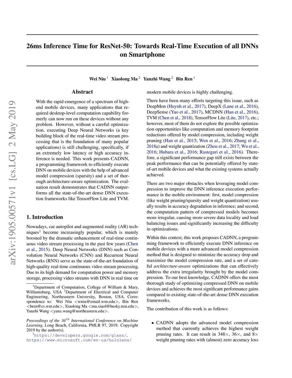 With the rapid emergence of a spectrum of high-end mobile devices, many applications that required desktop-level computation capability formerly can now run on these devices without any problem. However, without a careful optimization, executing Deep Neural Networks (a key building block of the real-time video stream processing that is the foundation of many popular applications) is still challenging, specifically, if an extremely low latency or high accuracy inference is needed. This work presents CADNN, a programming framework to efficiently execute DNN on mobile devices with the help of advanced model compression (sparsity) and a set of thorough architecture-aware optimization. The evaluation result demonstrates that CADNN outperforms all the state-of-the-art dense DNN execution frameworks like TensorFlow Lite and TVM.