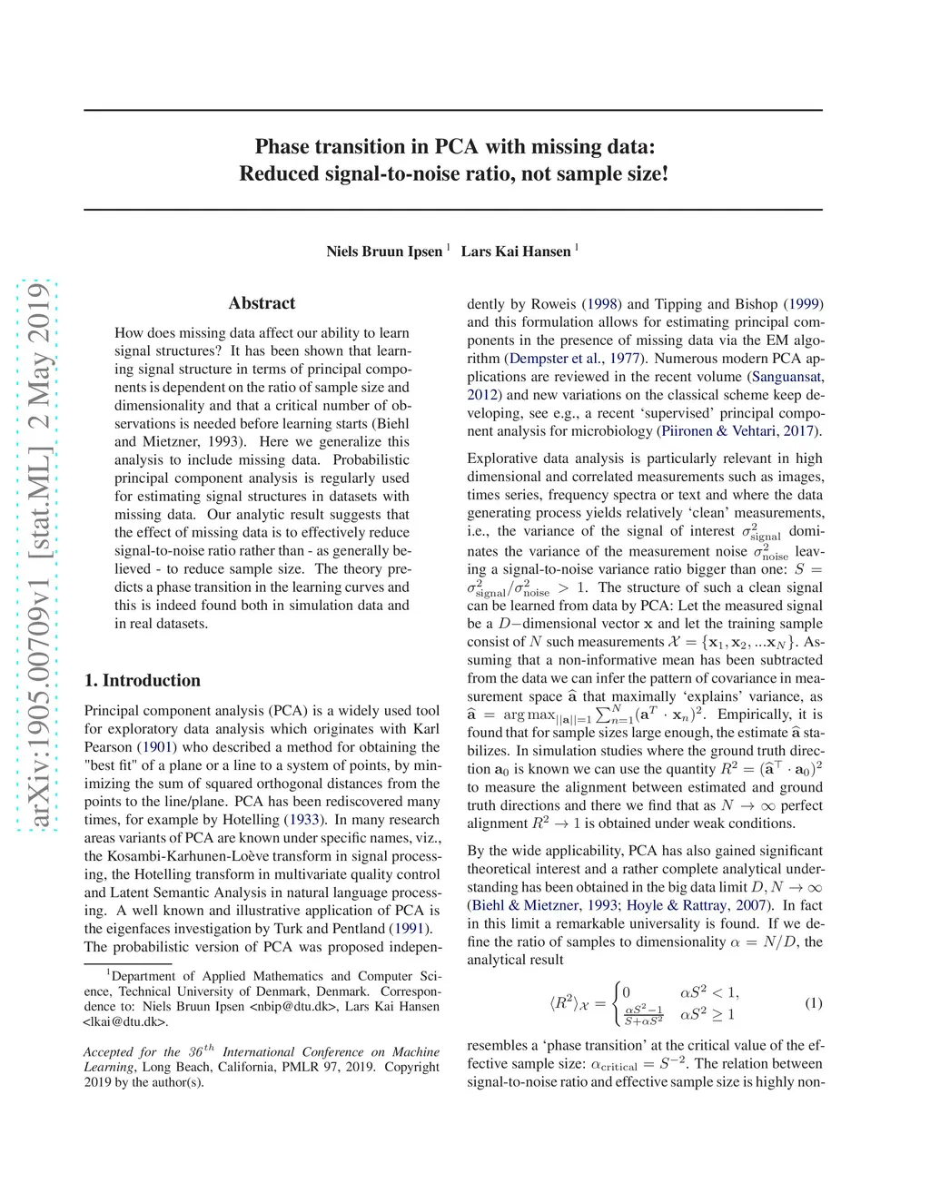 How does missing data affect our ability to learn signal structures? It has been shown that learning signal structure in terms of principal components is dependent on the ratio of sample size and dimensionality and that a critical number of observations is needed before learning starts (Biehl and Mietzner, 1993). Here we generalize this analysis to include missing data. Probabilistic principal component analysis is regularly used for estimating signal structures in datasets with missing data. Our analytic result suggests that the effect of missing data is to effectively reduce signal-to-noise ratio rather than - as generally believed - to reduce sample size. The theory predicts a phase transition in the learning curves and this is indeed found both in simulation data and in real datasets.