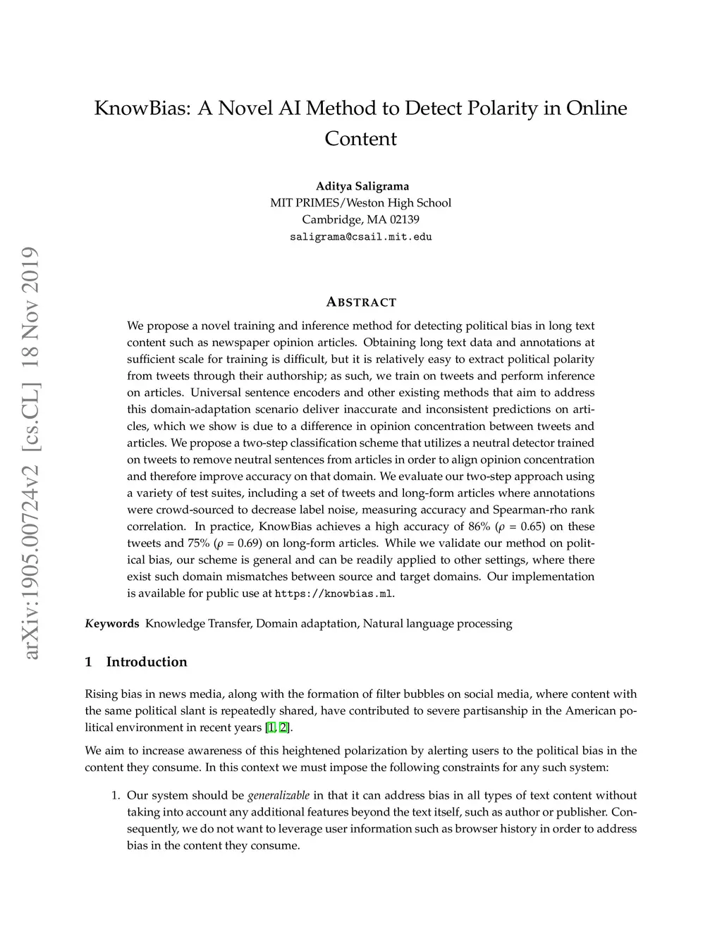 KnowBias: A Novel AI Method to Detect Polarity in Online Content