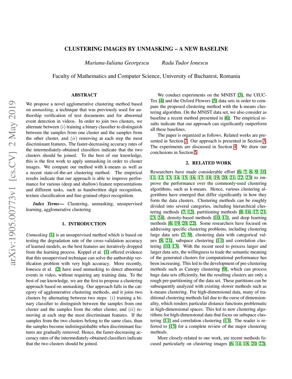 We propose a novel agglomerative clustering method based on unmasking, a technique that was previously used for authorship verification of text documents and for abnormal event detection in videos. In order to join two clusters, we alternate between (i) training a binary classifier to distinguish between the samples from one cluster and the samples from the other cluster, and (ii) removing at each step the most discriminant features. The faster-decreasing accuracy rates of the intermediately-obtained classifiers indicate that the two clusters should be joined. To the best of our knowledge, this is the first work to apply unmasking in order to cluster images. We compare our method with k-means as well as a recent state-of-the-art clustering method. The empirical results indicate that our approach is able to improve performance for various (deep and shallow) feature representations and different tasks, such as handwritten digit recognition, texture classification and fine-grained object recognition.