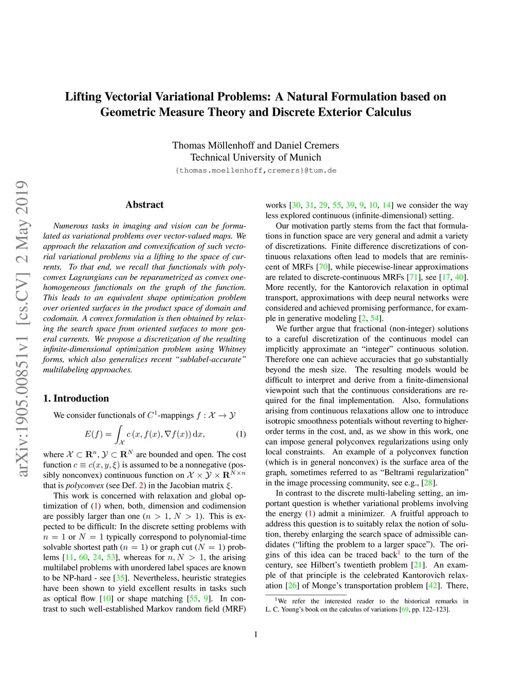 Numerous tasks in imaging and vision can be formulated as variational problems over vector-valued maps. We approach the relaxation and convexification of such vectorial variational problems via a lifting to the space of currents. To that end, we recall that functionals with polyconvex Lagrangians can be reparametrized as convex one-homogeneous functionals on the graph of the function. This leads to an equivalent shape optimization problem over oriented surfaces in the product space of domain and codomain. A convex formulation is then obtained by relaxing the search space from oriented surfaces to more general currents. We propose a discretization of the resulting infinite-dimensional optimization problem using Whitney forms, which also generalizes recent "sublabel-accurate" multilabeling approaches.