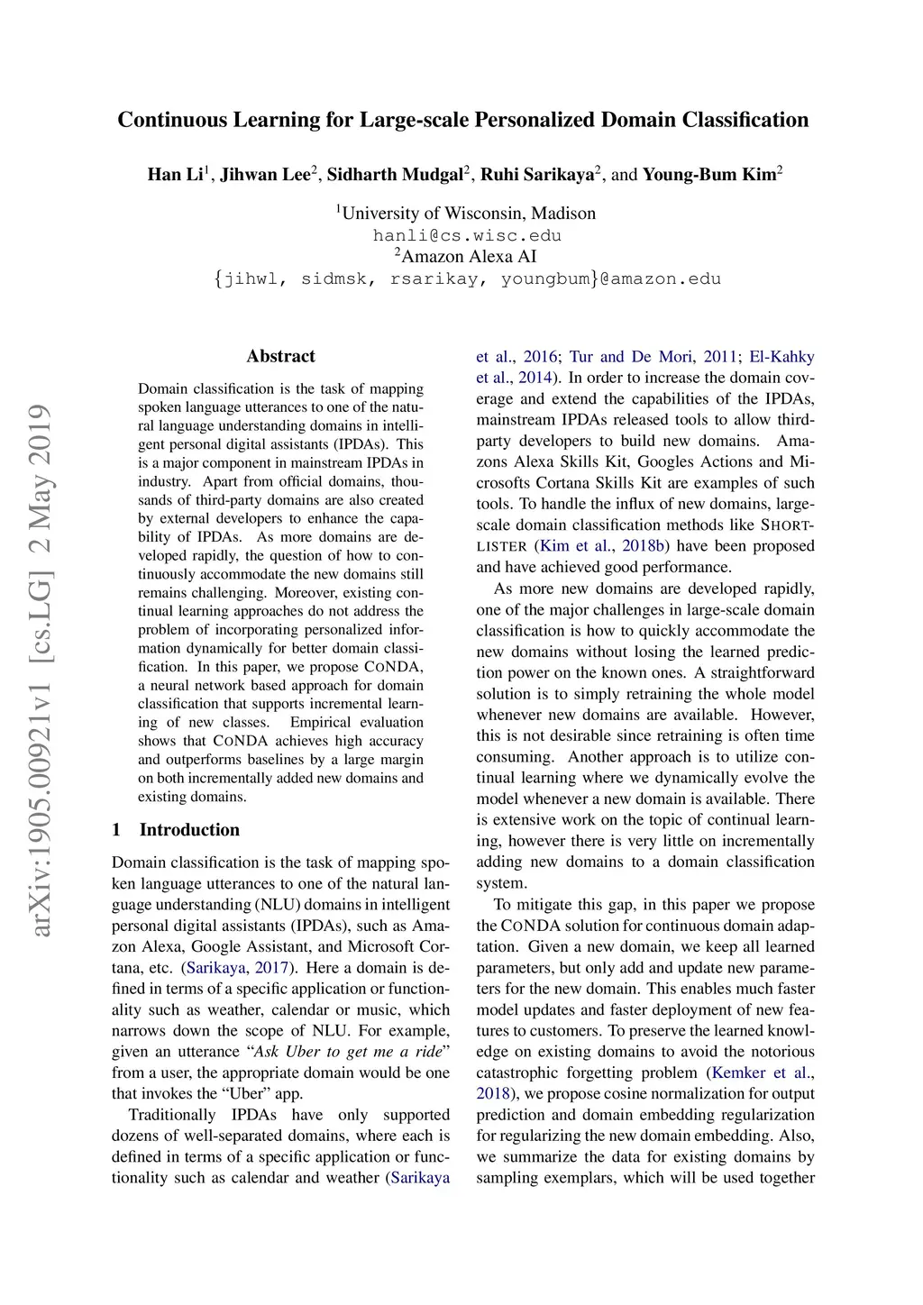 Domain classification is the task of mapping spoken language utterances to one of the natural language understanding domains in intelligent personal digital assistants (IPDAs). This is a major component in mainstream IPDAs in industry. Apart from official domains, thousands of third-party domains are also created by external developers to enhance the capability of IPDAs. As more domains are developed rapidly, the question of how to continuously accommodate the new domains still remains challenging. Moreover, existing continual learning approaches do not address the problem of incorporating personalized information dynamically for better domain classification. In this paper, we propose CoNDA, a neural network based approach for domain classification that supports incremental learning of new classes. Empirical evaluation shows that CoNDA achieves high accuracy and outperforms baselines by a large margin on both incrementally added new domains and existing domains.