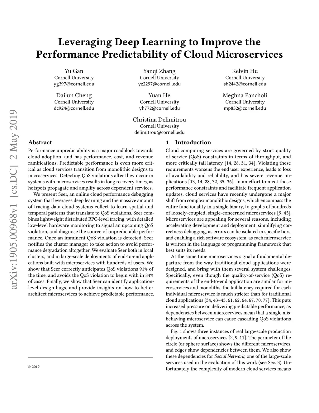 Performance unpredictability is a major roadblock towards cloud adoption, and has performance, cost, and revenue ramifications. Predictable performance is even more critical as cloud services transition from monolithic designs to microservices. Detecting QoS violations after they occur in systems with microservices results in long recovery times, as hotspots propagate and amplify across dependent services. We present Seer, an online cloud performance debugging system that leverages deep learning and the massive amount of tracing data cloud systems collect to learn spatial and temporal patterns that translate to QoS violations. Seer combines lightweight distributed RPC-level tracing, with detailed low-level hardware monitoring to signal an upcoming QoS violation, and diagnose the source of unpredictable performance. Once an imminent QoS violation is detected, Seer notifies the cluster manager to take action to avoid performance degradation altogether. We evaluate Seer both in local clusters, and in large-scale deployments of end-to-end applications built with microservices with hundreds of users. We show that Seer correctly anticipates QoS violations 91% of the time, and avoids the QoS violation to begin with in 84% of cases. Finally, we show that Seer can identify application-level design bugs, and provide insights on how to better architect microservices to achieve predictable performance.