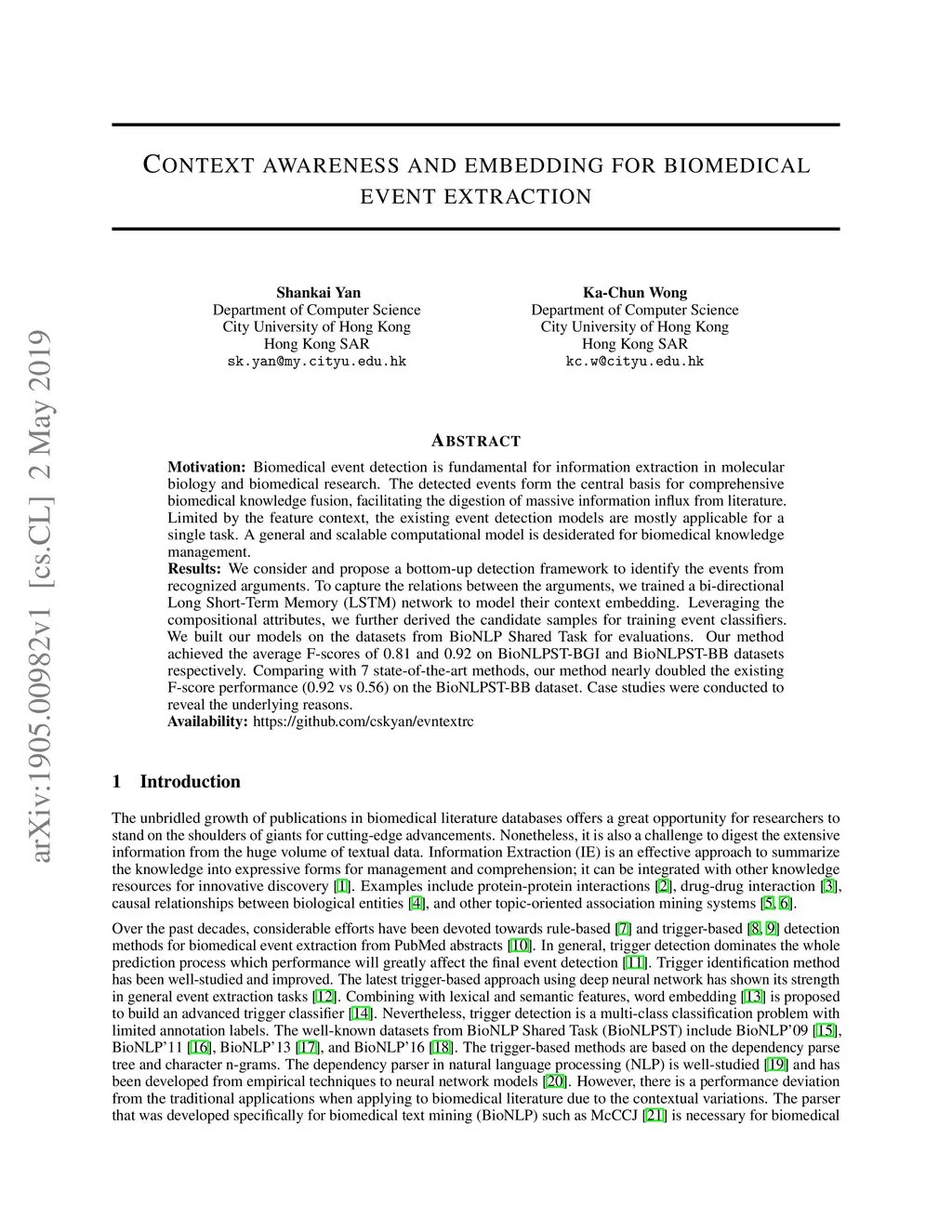 Context awareness and embedding for biomedical event extraction