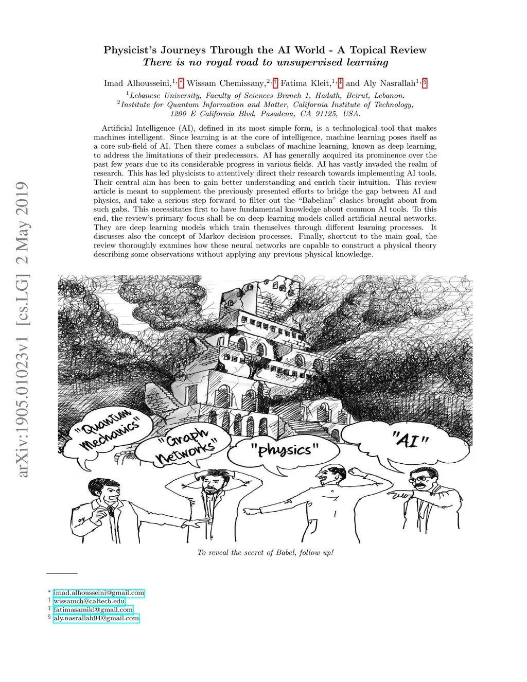 Artificial Intelligence (AI), defined in its most simple form, is a technological tool that makes machines intelligent. Since learning is at the core of intelligence, machine learning poses itself as a core sub-field of AI. Then there comes a subclass of machine learning, known as deep learning, to address the limitations of their predecessors. AI has generally acquired its prominence over the past few years due to its considerable progress in various fields. AI has vastly invaded the realm of research. This has led physicists to attentively direct their research towards implementing AI tools. Their central aim has been to gain better understanding and enrich their intuition. This review article is meant to supplement the previously presented efforts to bridge the gap between AI and physics, and take a serious step forward to filter out the "Babelian" clashes brought about from such gabs. This necessitates first to have fundamental knowledge about common AI tools. To this end, the review's primary focus shall be on deep learning models called artificial neural networks. They are deep learning models which train themselves through different learning processes. It discusses also the concept of Markov decision processes. Finally, shortcut to the main goal, the review thoroughly examines how these neural networks are capable to construct a physical theory describing some observations without applying any previous physical knowledge.