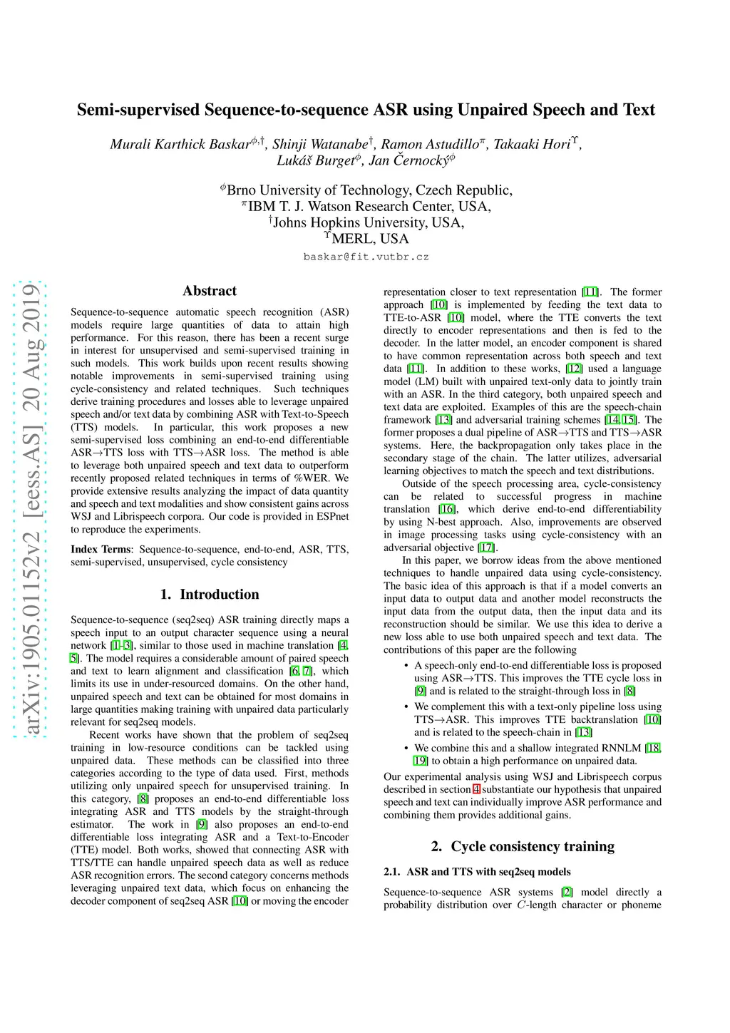 Sequence-to-sequence automatic speech recognition (ASR) models require large quantities of data to attain high performance. For this reason, there has been a recent surge in interest for unsupervised and semi-supervised training in such models. This work builds upon recent results showing notable improvements in semi-supervised training using cycle-consistency and related techniques. Such techniques derive training procedures and losses able to leverage unpaired speech and/or text data by combining ASR with Text-to-Speech (TTS) models. In particular, this work proposes a new semi-supervised loss combining an end-to-end differentiable ASRTTS loss with TTSASR loss. The method is able to leverage both unpaired speech and text data to outperform recently proposed related techniques in terms of \%WER. We provide extensive results analyzing the impact of data quantity and speech and text modalities and show consistent gains across WSJ and Librispeech corpora. Our code is provided in ESPnet to reproduce the experiments.