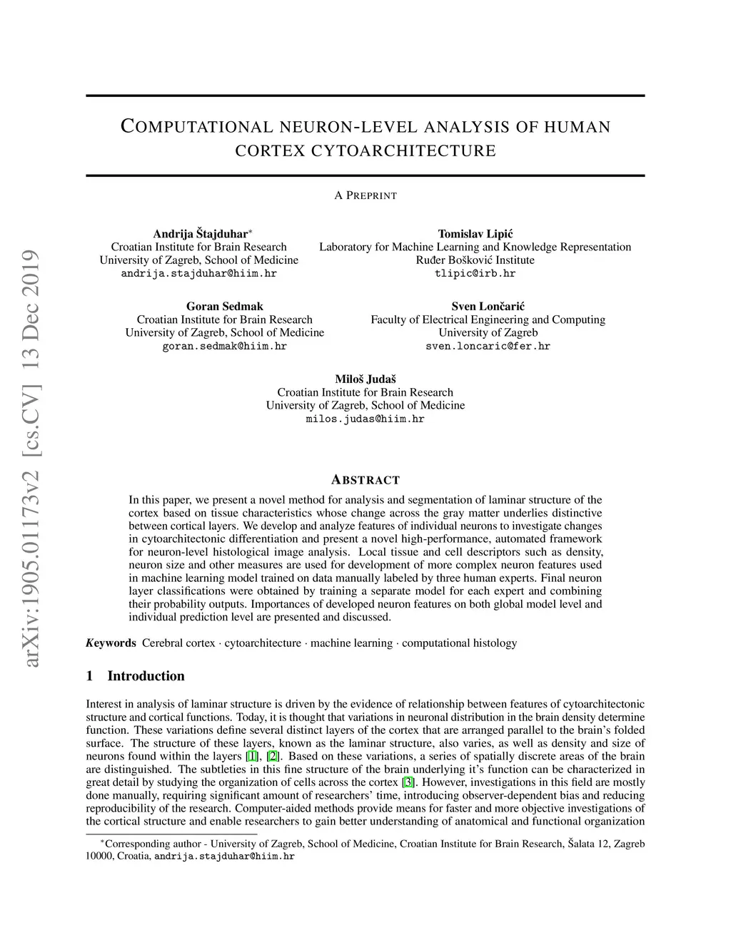In this paper, we present a novel method for analysis and segmentation of laminar structure of the cortex based on tissue characteristics whose change across the gray matter underlies distinctive between cortical layers. We develop and analyze features of individual neurons to investigate changes in cytoarchitectonic differentiation and present a novel high-performance, automated framework for neuron-level histological image analysis. Local tissue and cell descriptors such as density, neuron size and other measures are used for development of more complex neuron features used in machine learning model trained on data manually labeled by three human experts. Final neuron layer classifications were obtained by training a separate model for each expert and combining their probability outputs. Importances of developed neuron features on both global model level and individual prediction level are presented and discussed.