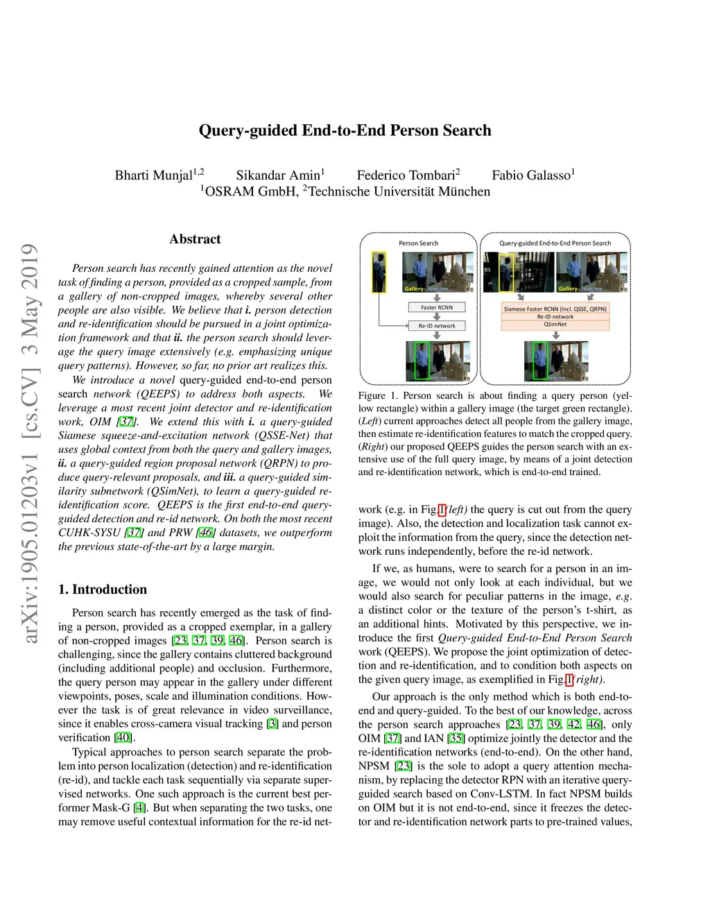 Person search has recently gained attention as the novel task of finding a person, provided as a cropped sample, from a gallery of non-cropped images, whereby several other people are also visible. We believe that i. person detection and re-identification should be pursued in a joint optimization framework and that ii. the person search should leverage the query image extensively (e.g. emphasizing unique query patterns). However, so far, no prior art realizes this. We introduce a novel query-guided end-to-end person search network (QEEPS) to address both aspects. We leverage a most recent joint detector and re-identification work, OIM [37]. We extend this with i. a query-guided Siamese squeeze-and-excitation network (QSSE-Net) that uses global context from both the query and gallery images, ii. a query-guided region proposal network (QRPN) to produce query-relevant proposals, and iii. a query-guided similarity subnetwork (QSimNet), to learn a query-guided reidentification score. QEEPS is the first end-to-end query-guided detection and re-id network. On both the most recent CUHK-SYSU [37] and PRW [46] datasets, we outperform the previous state-of-the-art by a large margin.
