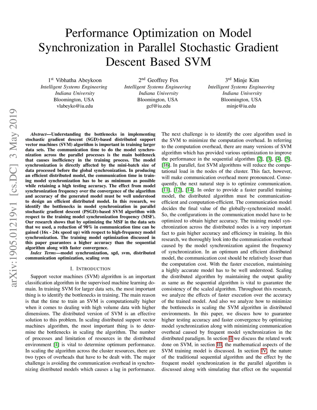 Understanding the bottlenecks in implementing stochastic gradient descent (SGD)-based distributed support vector machines (SVM) algorithm is important in training larger data sets. The communication time to do the model synchronization across the parallel processes is the main bottleneck that causes inefficiency in the training process. The model synchronization is directly affected by the mini-batch size of data processed before the global synchronization. In producing an efficient distributed model, the communication time in training model synchronization has to be as minimum as possible while retaining a high testing accuracy. The effect from model synchronization frequency over the convergence of the algorithm and accuracy of the generated model must be well understood to design an efficient distributed model. In this research, we identify the bottlenecks in model synchronization in parallel stochastic gradient descent (PSGD)-based SVM algorithm with respect to the training model synchronization frequency (MSF). Our research shows that by optimizing the MSF in the data sets that we used, a reduction of 98\% in communication time can be gained (16x - 24x speed up) with respect to high-frequency model synchronization. The training model optimization discussed in this paper guarantees a higher accuracy than the sequential algorithm along with faster convergence.