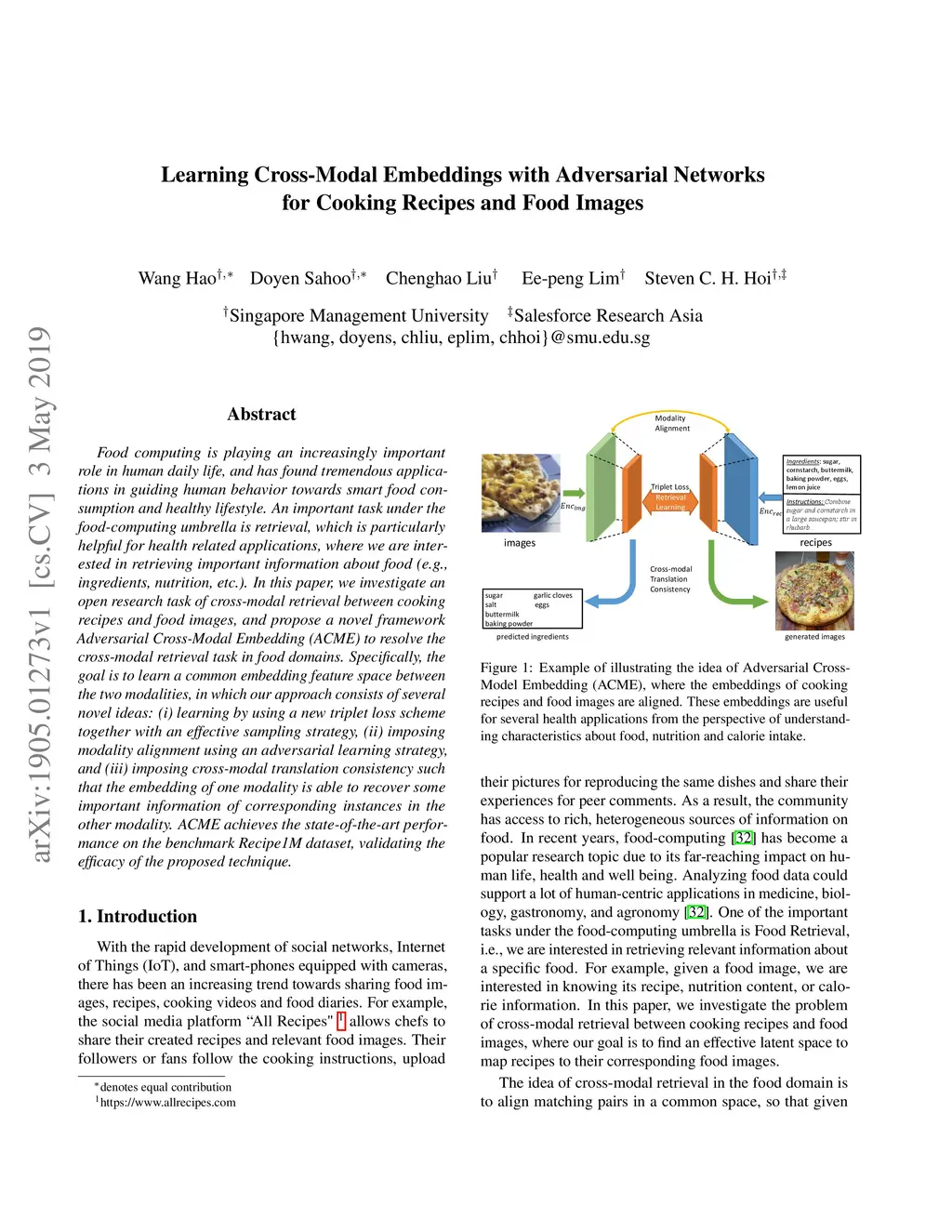 Food computing is playing an increasingly important role in human daily life, and has found tremendous applications in guiding human behavior towards smart food consumption and healthy lifestyle. An important task under the food-computing umbrella is retrieval, which is particularly helpful for health related applications, where we are interested in retrieving important information about food (e.g., ingredients, nutrition, etc.). In this paper, we investigate an open research task of cross-modal retrieval between cooking recipes and food images, and propose a novel framework Adversarial Cross-Modal Embedding (ACME) to resolve the cross-modal retrieval task in food domains. Specifically, the goal is to learn a common embedding feature space between the two modalities, in which our approach consists of several novel ideas: (i) learning by using a new triplet loss scheme together with an effective sampling strategy, (ii) imposing modality alignment using an adversarial learning strategy, and (iii) imposing cross-modal translation consistency such that the embedding of one modality is able to recover some important information of corresponding instances in the other modality. ACME achieves the state-of-the-art performance on the benchmark Recipe1M dataset, validating the efficacy of the proposed technique.