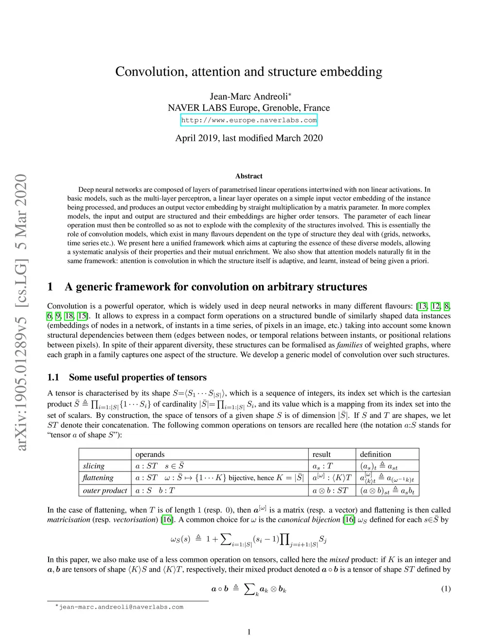 Deep neural networks are composed of layers of parametrised linear operations intertwined with non linear activations. In basic models, such as the multi-layer perceptron, a linear layer operates on a simple input vector embedding of the instance being processed, and produces an output vector embedding by straight multiplication by a matrix parameter. In more complex models, the input and output are structured and their embeddings are higher order tensors. The parameter of each linear operation must then be controlled so as not to explode with the complexity of the structures involved. This is essentially the role of convolution models, which exist in many flavours dependent on the type of structure they deal with (grids, networks, time series etc.). We present here a unified framework which aims at capturing the essence of these diverse models, allowing a systematic analysis of their properties and their mutual enrichment. We also show that attention models naturally fit in the same framework: attention is convolution in which the structure itself is adaptive, and learnt, instead of being given a priori.