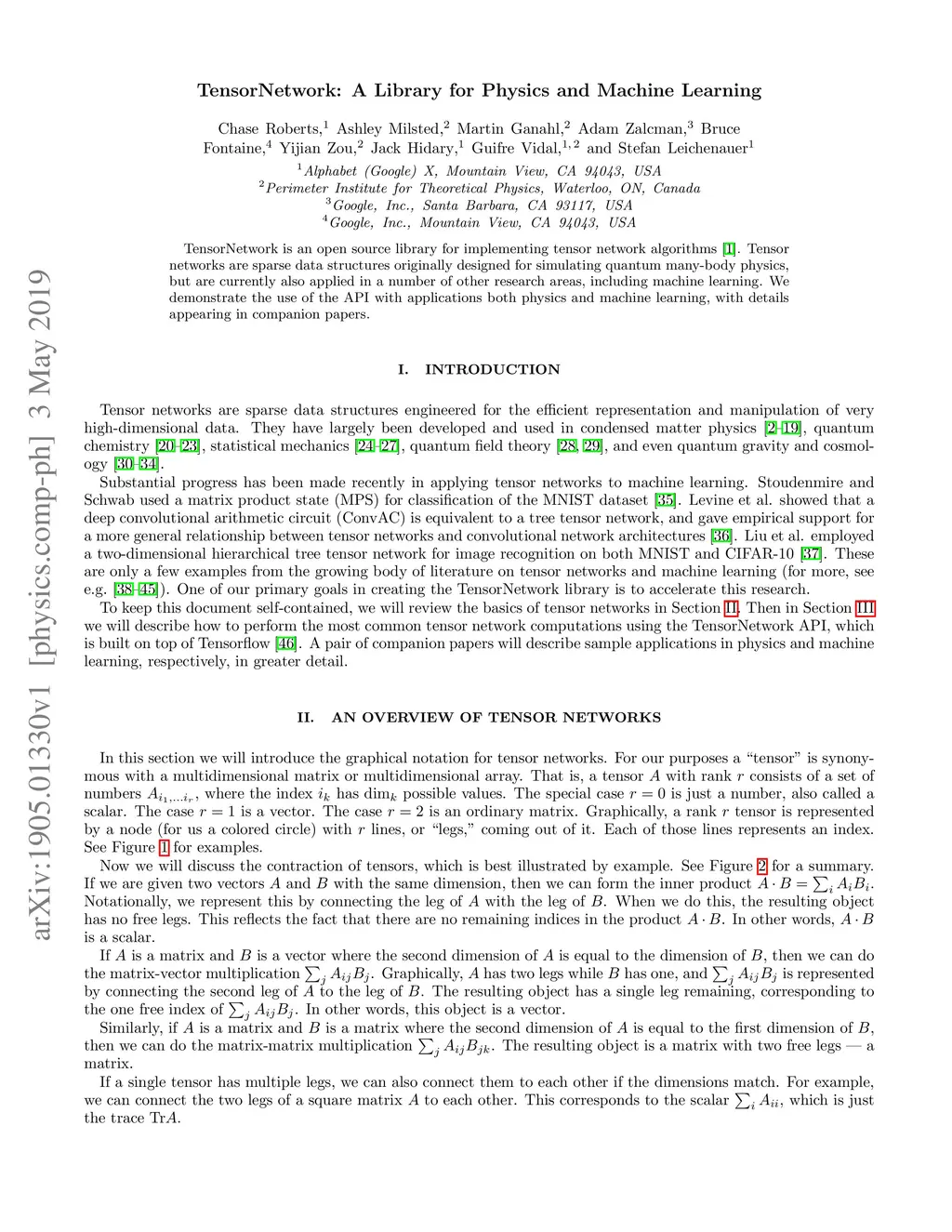 TensorNetwork is an open source library for implementing tensor network algorithms. Tensor networks are sparse data structures originally designed for simulating quantum many-body physics, but are currently also applied in a number of other research areas, including machine learning. We demonstrate the use of the API with applications both physics and machine learning, with details appearing in companion papers.