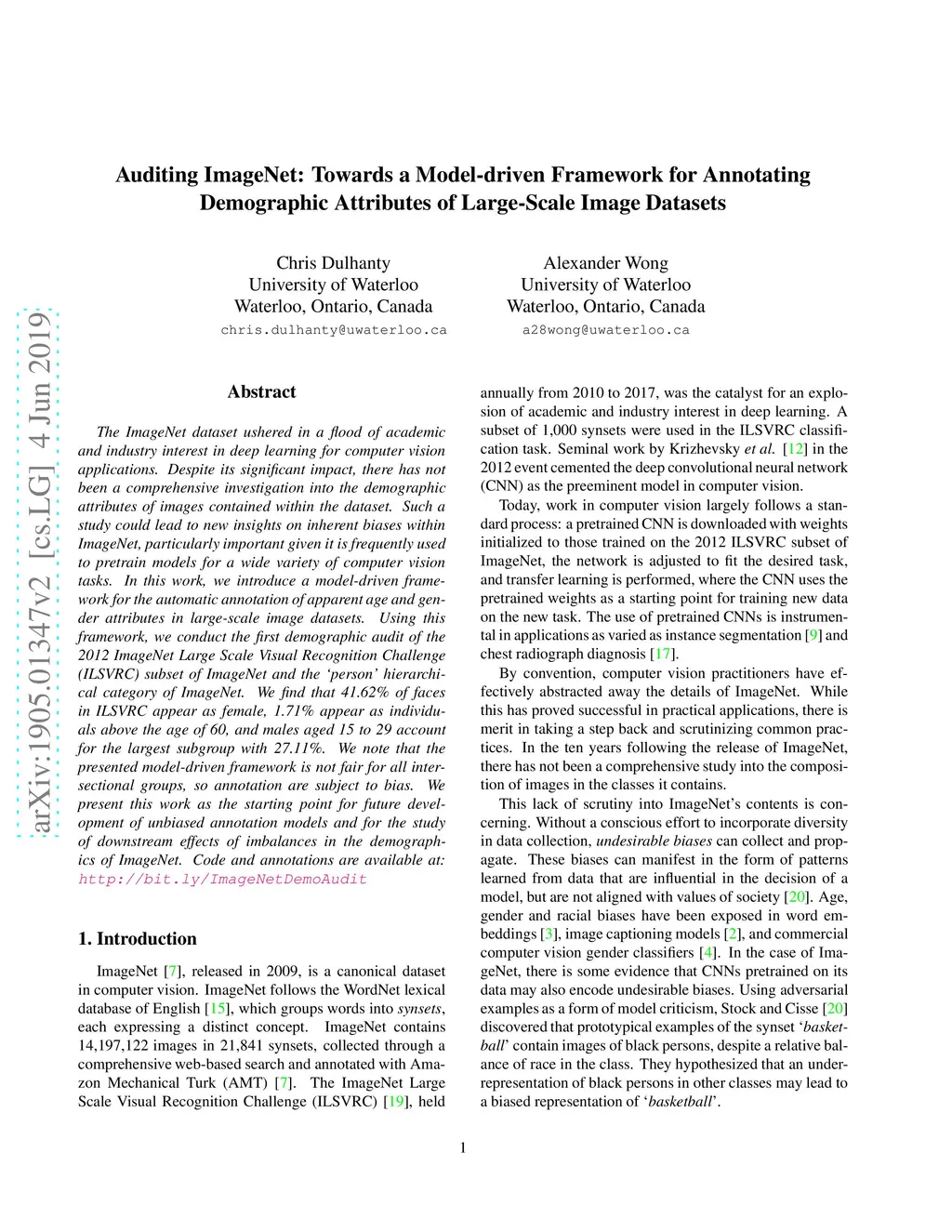 The ImageNet dataset ushered in a flood of academic and industry interest in deep learning for computer vision applications. Despite its significant impact, there has not been a comprehensive investigation into the demographic attributes of images contained within the dataset. Such a study could lead to new insights on inherent biases within ImageNet, particularly important given it is frequently used to pretrain models for a wide variety of computer vision tasks. In this work, we introduce a model-driven framework for the automatic annotation of apparent age and gender attributes in large-scale image datasets. Using this framework, we conduct the first demographic audit of the 2012 ImageNet Large Scale Visual Recognition Challenge (ILSVRC) subset of ImageNet and the "person" hierarchical category of ImageNet. We find that 41.62% of faces in ILSVRC appear as female, 1.71% appear as individuals above the age of 60, and males aged 15 to 29 account for the largest subgroup with 27.11%. We note that the presented model-driven framework is not fair for all intersectional groups, so annotation are subject to bias. We present this work as the starting point for future development of unbiased annotation models and for the study of downstream effects of imbalances in the demographics of ImageNet. Code and annotations are available at: http://bit.ly/ImageNetDemoAudit