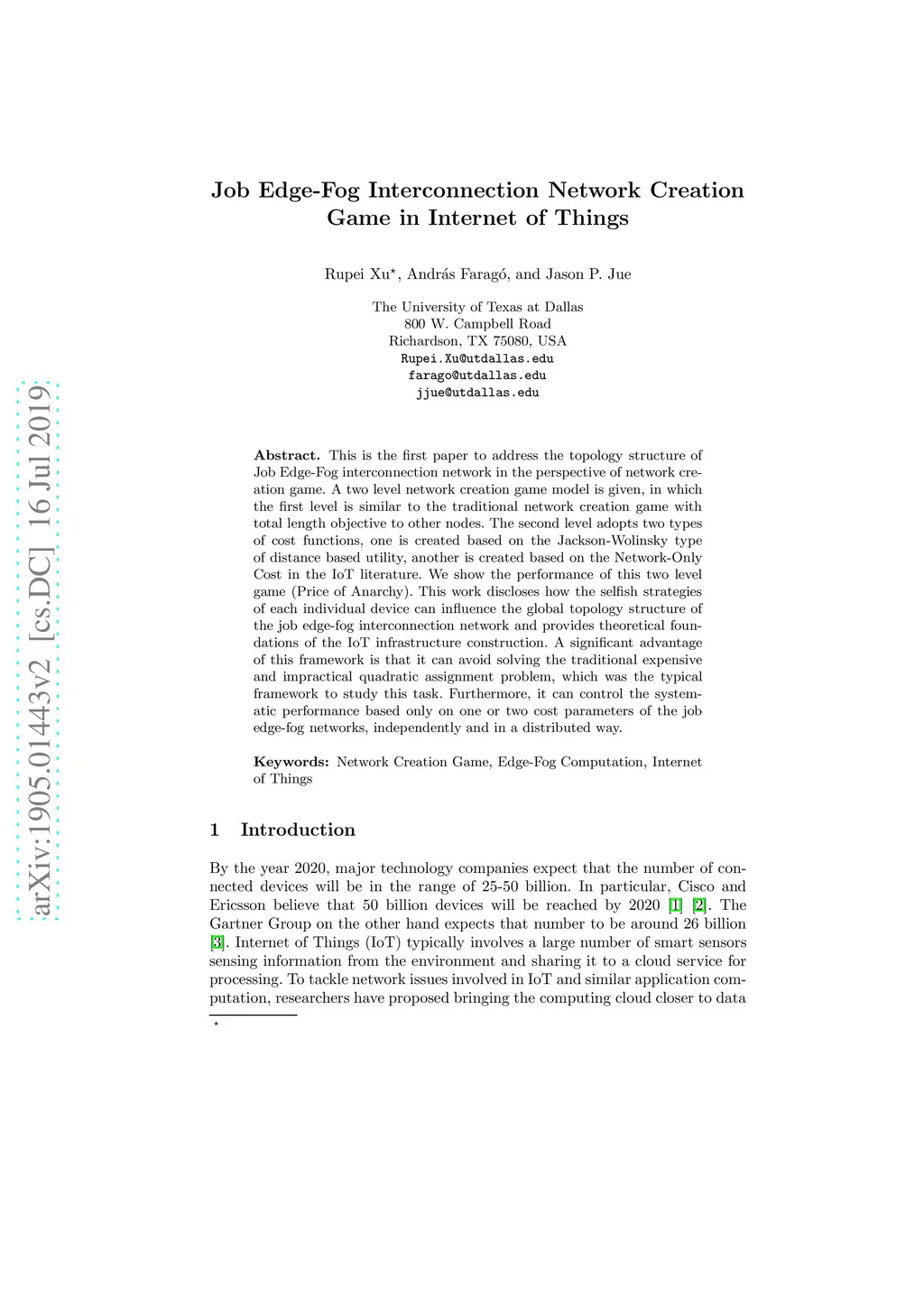Job Edge-Fog Interconnection Network Creation Game in Internet of Things