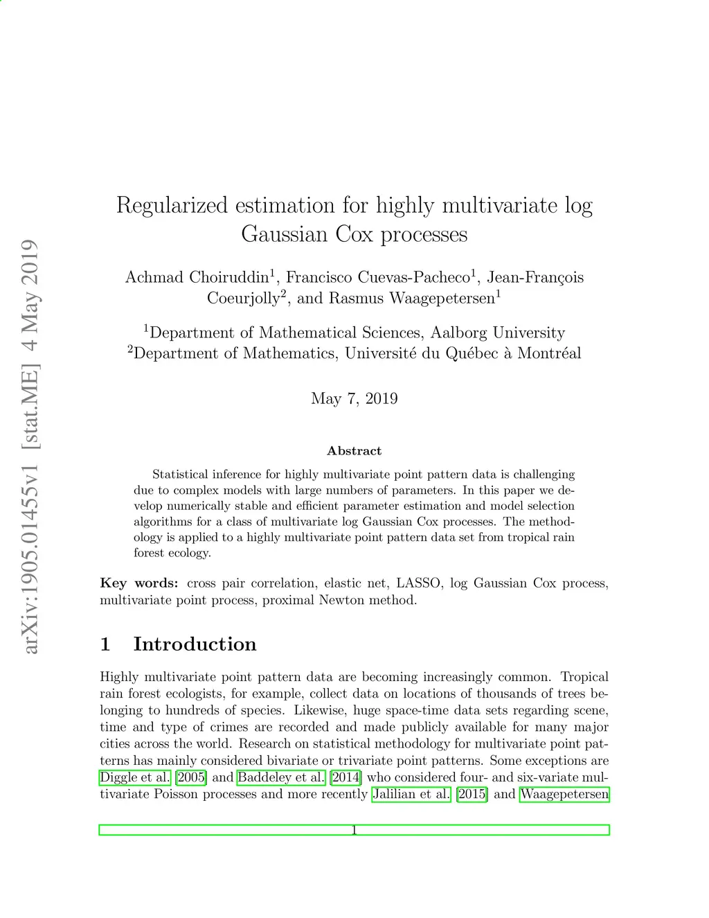 Statistical inference for highly multivariate point pattern data is challenging due to complex models with large numbers of parameters. In this paper, we develop numerically stable and efficient parameter estimation and model selection algorithms for a class of multivariate log Gaussian Cox processes. The methodology is applied to a highly multivariate point pattern data set from tropical rain forest ecology.