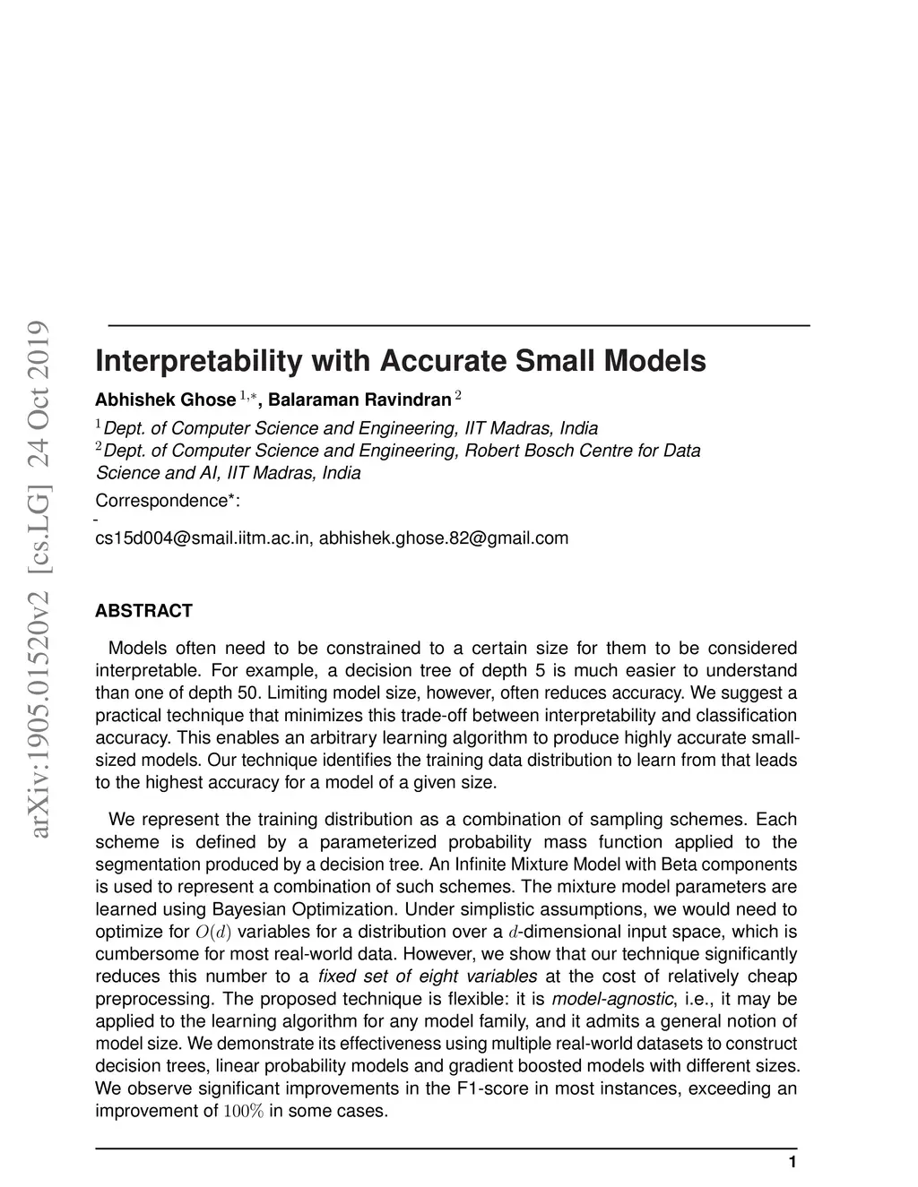 Models often need to be constrained to a certain size for them to be considered interpretable. For example, a decision tree of depth 5 is much easier to understand than one of depth 50. Limiting model size, however, often reduces accuracy. We suggest a practical technique that minimizes this trade-off between interpretability and classification accuracy. This enables an arbitrary learning algorithm to produce highly accurate small-sized models. Our technique identifies the training data distribution to learn from that leads to the highest accuracy for a model of a given size. We represent the training distribution as a combination of sampling schemes. Each scheme is defined by a parameterized probability mass function applied to the segmentation produced by a decision tree. An Infinite Mixture Model with Beta components is used to represent a combination of such schemes. The mixture model parameters are learned using Bayesian Optimization. Under simplistic assumptions, we would need to optimize for variables for a distribution over a -dimensional input space, which is cumbersome for most real-world data. However, we show that our technique significantly reduces this number to a \emph{fixed set of eight variables} at the cost of relatively cheap preprocessing. The proposed technique is flexible: it is \emph{model-agnostic}, i.e., it may be applied to the learning algorithm for any model family, and it admits a general notion of model size. We demonstrate its effectiveness using multiple real-world datasets to construct decision trees, linear probability models and gradient boosted models with different sizes. We observe significant improvements in the F1-score in most instances, exceeding an improvement of in some cases.