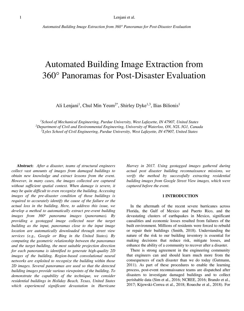 After a disaster, teams of structural engineers collect vast amounts of images from damaged buildings to obtain new knowledge and extract lessons from the event. However, in many cases, the images collected are captured without sufficient spatial context. When damage is severe, it may be quite difficult to even recognize the building. Accessing images of the pre-disaster condition of those buildings is required to accurately identify the cause of the failure or the actual loss in the building. Here, to address this issue, we develop a method to automatically extract pre-event building images from 360o panorama images (panoramas). By providing a geotagged image collected near the target building as the input, panoramas close to the input image location are automatically downloaded through street view services (e.g., Google or Bing in the United States). By computing the geometric relationship between the panoramas and the target building, the most suitable projection direction for each panorama is identified to generate high-quality 2D images of the building. Region-based convolutional neural networks are exploited to recognize the building within those 2D images. Several panoramas are used so that the detected building images provide various viewpoints of the building. To demonstrate the capability of the technique, we consider residential buildings in Holiday Beach, Texas, the United States which experienced significant devastation in Hurricane Harvey in 2017. Using geotagged images gathered during actual post-disaster building reconnaissance missions, we verify the method by successfully extracting residential building images from Google Street View images, which were captured before the event.