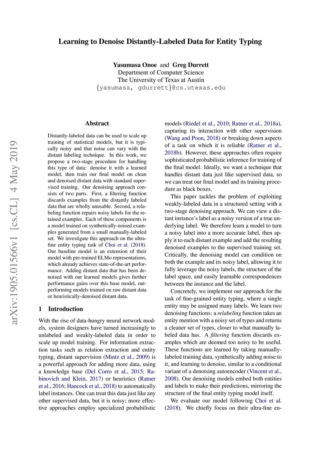 Distantly-labeled data can be used to scale up training of statistical models, but it is typically noisy and that noise can vary with the distant labeling technique. In this work, we propose a two-stage procedure for handling this type of data: denoise it with a learned model, then train our final model on clean and denoised distant data with standard supervised training. Our denoising approach consists of two parts. First, a filtering function discards examples from the distantly labeled data that are wholly unusable. Second, a relabeling function repairs noisy labels for the retained examples. Each of these components is a model trained on synthetically-noised examples generated from a small manually-labeled set. We investigate this approach on the ultra-fine entity typing task of Choi et al. (2018). Our baseline model is an extension of their model with pre-trained ELMo representations, which already achieves state-of-the-art performance. Adding distant data that has been denoised with our learned models gives further performance gains over this base model, outperforming models trained on raw distant data or heuristically-denoised distant data.