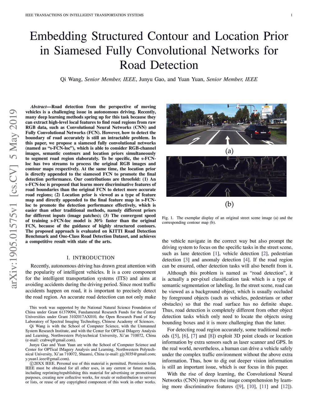 Road detection from the perspective of moving vehicles is a challenging issue in autonomous driving. Recently, many deep learning methods spring up for this task because they can extract high-level local features to find road regions from raw RGB data, such as Convolutional Neural Networks (CNN) and Fully Convolutional Networks (FCN). However, how to detect the boundary of road accurately is still an intractable problem. In this paper, we propose a siamesed fully convolutional networks (named as ``s-FCN-loc''), which is able to consider RGB-channel images, semantic contours and location priors simultaneously to segment road region elaborately. To be specific, the s-FCN-loc has two streams to process the original RGB images and contour maps respectively. At the same time, the location prior is directly appended to the siamesed FCN to promote the final detection performance. Our contributions are threefold: (1) An s-FCN-loc is proposed that learns more discriminative features of road boundaries than the original FCN to detect more accurate road regions; (2) Location prior is viewed as a type of feature map and directly appended to the final feature map in s-FCN-loc to promote the detection performance effectively, which is easier than other traditional methods, namely different priors for different inputs (image patches); (3) The convergent speed of training s-FCN-loc model is 30\% faster than the original FCN, because of the guidance of highly structured contours. The proposed approach is evaluated on KITTI Road Detection Benchmark and One-Class Road Detection Dataset, and achieves a competitive result with state of the arts.