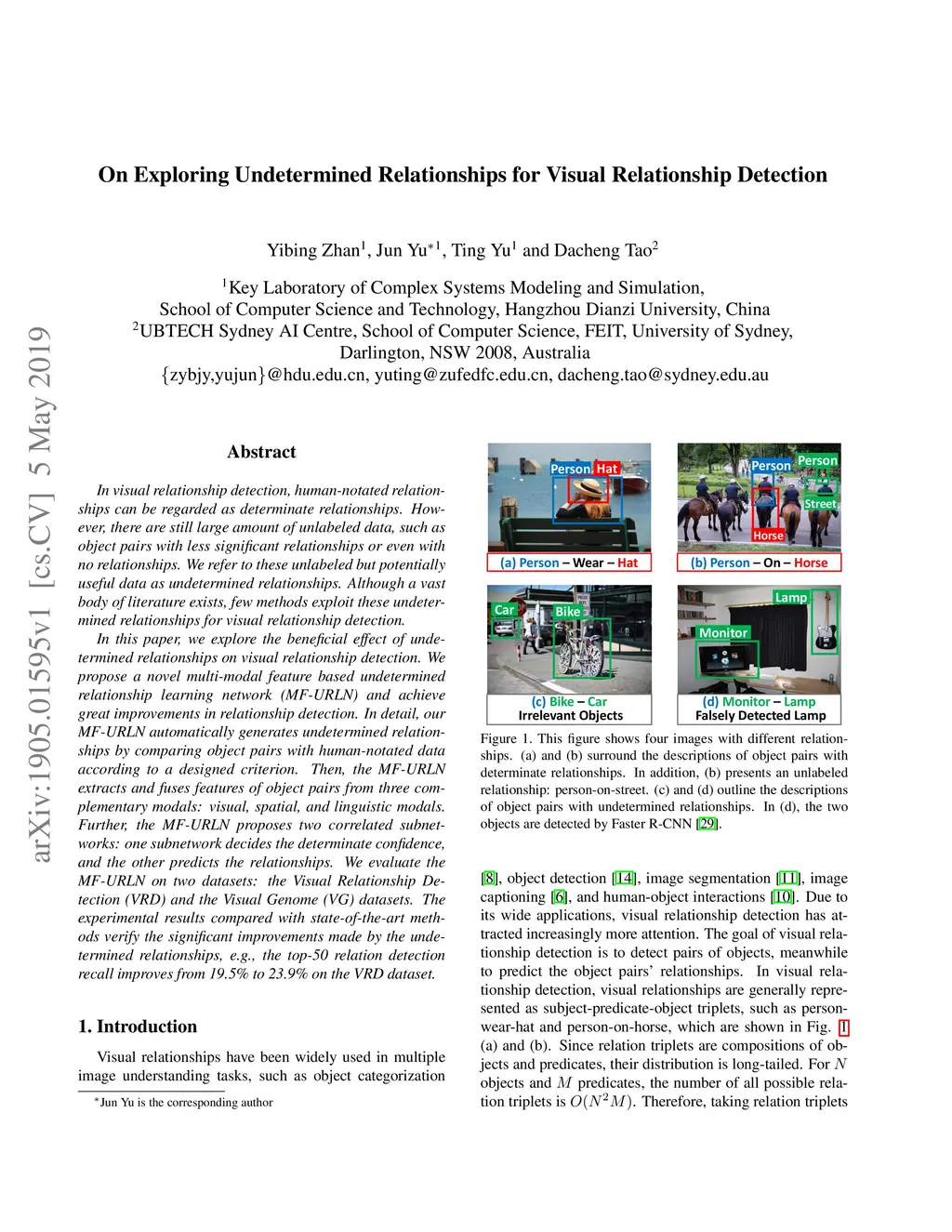 In visual relationship detection, human-notated relationships can be regarded as determinate relationships. However, there are still large amount of unlabeled data, such as object pairs with less significant relationships or even with no relationships. We refer to these unlabeled but potentially useful data as undetermined relationships. Although a vast body of literature exists, few methods exploit these undetermined relationships for visual relationship detection. In this paper, we explore the beneficial effect of undetermined relationships on visual relationship detection. We propose a novel multi-modal feature based undetermined relationship learning network (MF-URLN) and achieve great improvements in relationship detection. In detail, our MF-URLN automatically generates undetermined relationships by comparing object pairs with human-notated data according to a designed criterion. Then, the MF-URLN extracts and fuses features of object pairs from three complementary modals: visual, spatial, and linguistic modals. Further, the MF-URLN proposes two correlated subnetworks: one subnetwork decides the determinate confidence, and the other predicts the relationships. We evaluate the MF-URLN on two datasets: the Visual Relationship Detection (VRD) and the Visual Genome (VG) datasets. The experimental results compared with state-of-the-art methods verify the significant improvements made by the undetermined relationships, e.g., the top-50 relation detection recall improves from 19.5% to 23.9% on the VRD dataset.