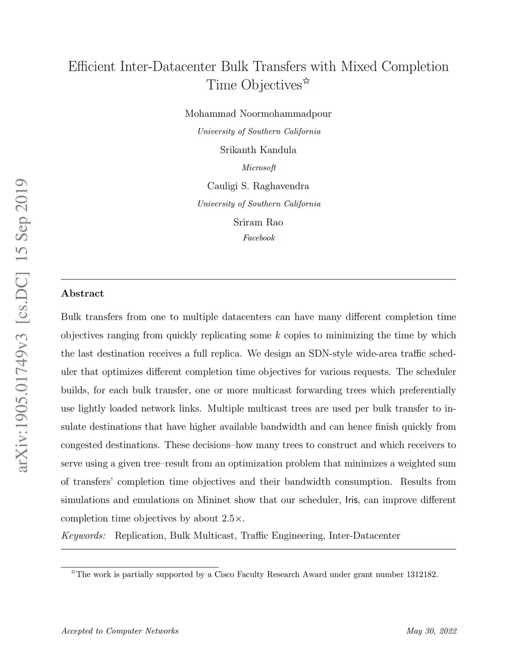 Bulk transfers from one to multiple datacenters can have many different completion time objectives ranging from quickly replicating some copies to minimizing the time by which the last destination receives a full replica. We design an SDN-style wide-area traffic scheduler that optimizes different completion time objectives for various requests. The scheduler builds, for each bulk transfer, one or more multicast forwarding trees which preferentially use lightly loaded network links. Multiple multicast trees are used per bulk transfer to insulate destinations that have higher available bandwidth and can hence finish quickly from congested destinations. These decisions--how many trees to construct and which receivers to serve using a given tree--result from an optimization problem that minimizes a weighted sum of transfers' completion time objectives and their bandwidth consumption. Results from simulations and emulations on Mininet show that our scheduler, Iris, can improve different completion time objectives by about .