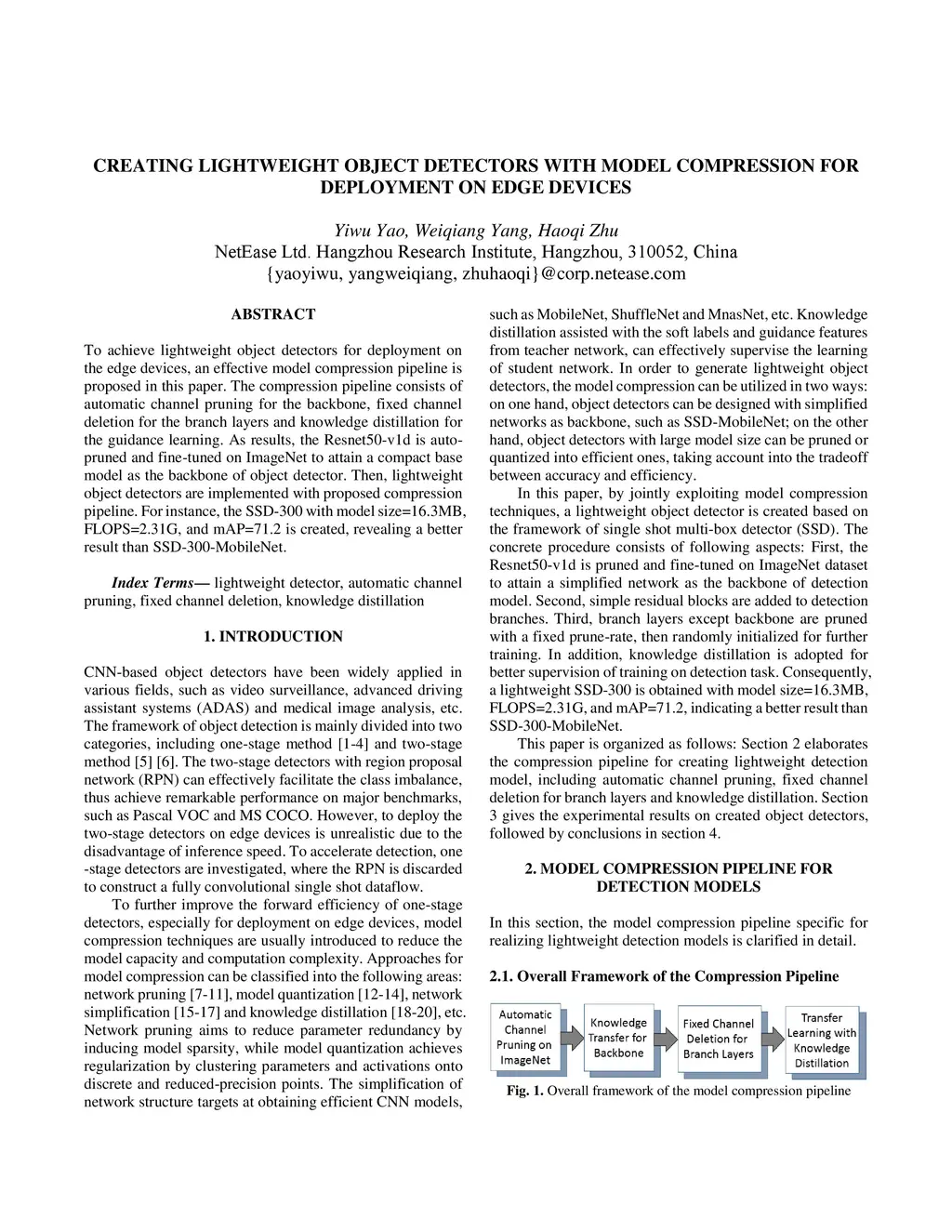 To achieve lightweight object detectors for deployment on the edge devices, an effective model compression pipeline is proposed in this paper. The compression pipeline consists of automatic channel pruning for the backbone, fixed channel deletion for the branch layers and knowledge distillation for the guidance learning. As results, the Resnet50-v1d is auto-pruned and fine-tuned on ImageNet to attain a compact base model as the backbone of object detector. Then, lightweight object detectors are implemented with proposed compression pipeline. For instance, the SSD-300 with model size=16.3MB, FLOPS=2.31G, and mAP=71.2 is created, revealing a better result than SSD-300-MobileNet.
