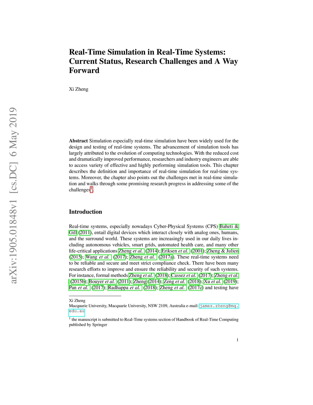Simulation especially real-time simulation have been widely used for the design and testing of real-time systems. The advancement of simulation tools has largely attributed to the evolution of computing technologies. With the reduced cost and dramatically improved performance, researchers and industry engineers are able to access variety of effective and highly performing simulation tools. This chapter describes the definition and importance of real-time simulation for real-time systems. Moreover, the chapter also points out the challenges met in real-time simulation and walks through some promising research progress in addressing some of the challenges.