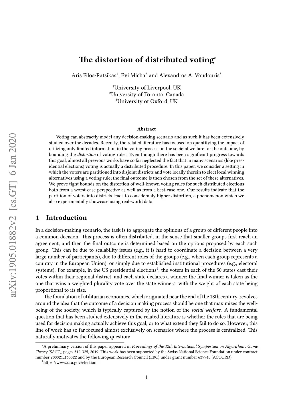 Voting can abstractly model any decision-making scenario and as such it has been extensively studied over the decades. Recently, the related literature has focused on quantifying the impact of utilizing only limited information in the voting process on the societal welfare for the outcome, by bounding the distortion of voting rules. Even though there has been significant progress towards this goal, all previous works have so far neglected the fact that in many scenarios (like presidential elections) voting is actually a distributed procedure. In this paper, we consider a setting in which the voters are partitioned into disjoint districts and vote locally therein to elect local winning alternatives using a voting rule; the final outcome is then chosen from the set of these alternatives. We prove tight bounds on the distortion of well-known voting rules for such distributed elections both from a worst-case perspective as well as from a best-case one. Our results indicate that the partition of voters into districts leads to considerably higher distortion, a phenomenon which we also experimentally showcase using real-world data.