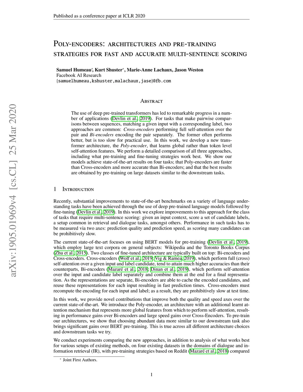 The use of deep pre-trained bidirectional transformers has led to remarkable progress in a number of applications (Devlin et al., 2018). For tasks that make pairwise comparisons between sequences, matching a given input with a corresponding label, two approaches are common: Cross-encoders performing full self-attention over the pair and Bi-encoders encoding the pair separately. The former often performs better, but is too slow for practical use. In this work, we develop a new transformer architecture, the Poly-encoder, that learns global rather than token level self-attention features. We perform a detailed comparison of all three approaches, including what pre-training and fine-tuning strategies work best. We show our models achieve state-of-the-art results on three existing tasks; that Poly-encoders are faster than Cross-encoders and more accurate than Bi-encoders; and that the best results are obtained by pre-training on large datasets similar to the downstream tasks.