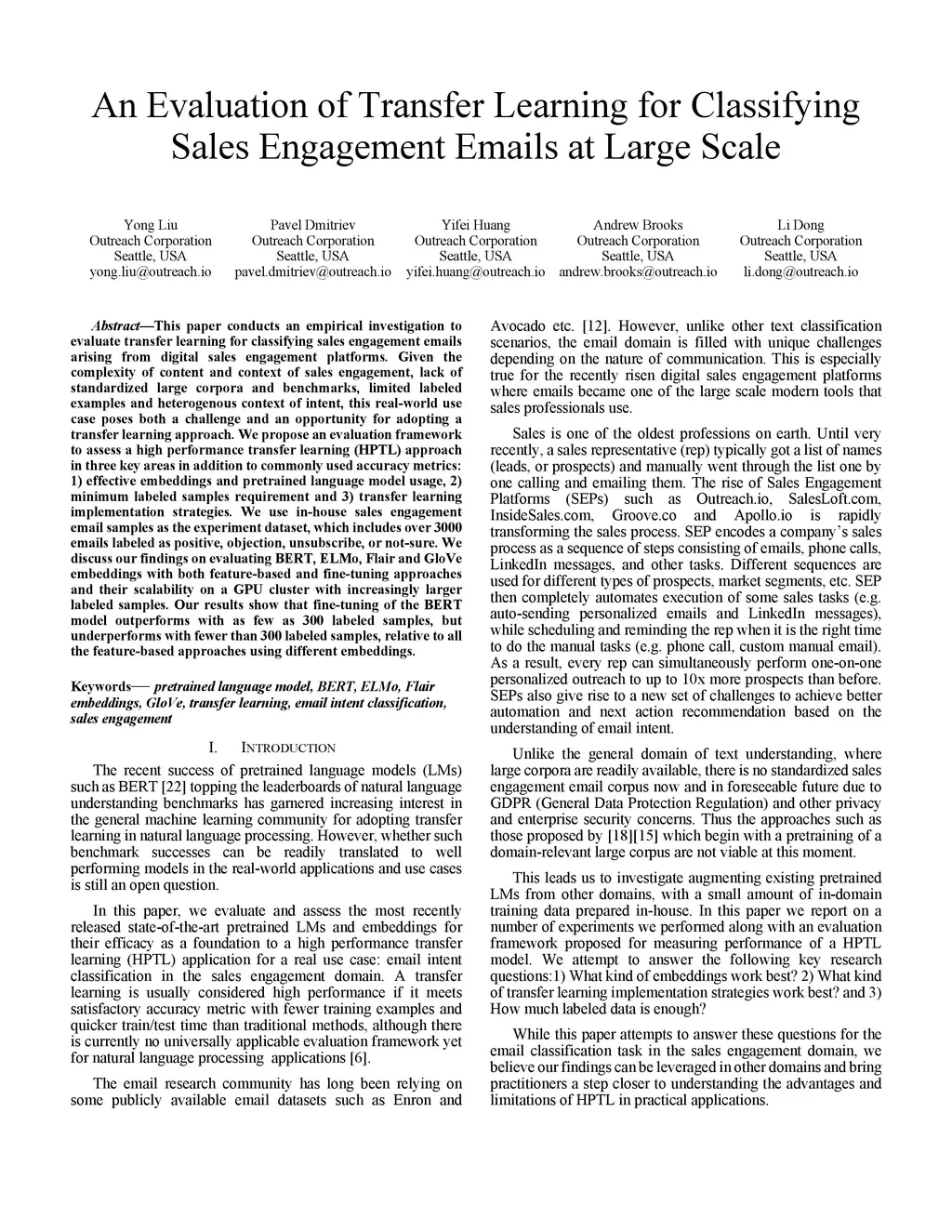This paper conducts an empirical investigation to evaluate transfer learning for classifying sales engagement emails arising from digital sales engagement platforms. Given the complexity of content and context of sales engagement, lack of standardized large corpora and benchmarks, limited labeled examples and heterogenous context of intent, this real-world use case poses both a challenge and an opportunity for adopting a transfer learning approach. We propose an evaluation framework to assess a high performance transfer learning (HPTL) approach in three key areas in addition to commonly used accuracy metrics: 1) effective embeddings and pretrained language model usage, 2) minimum labeled samples requirement and 3) transfer learning implementation strategies. We use in-house sales engagement email samples as the experiment dataset, which includes over 3000 emails labeled as positive, objection, unsubscribe, or not-sure. We discuss our findings on evaluating BERT, ELMo, Flair and GloVe embeddings with both feature-based and fine-tuning approaches and their scalability on a GPU cluster with increasingly larger labeled samples. Our results show that fine-tuning of the BERT model outperforms with as few as 300 labeled samples, but underperforms with fewer than 300 labeled samples, relative to all the feature-based approaches using different embeddings.