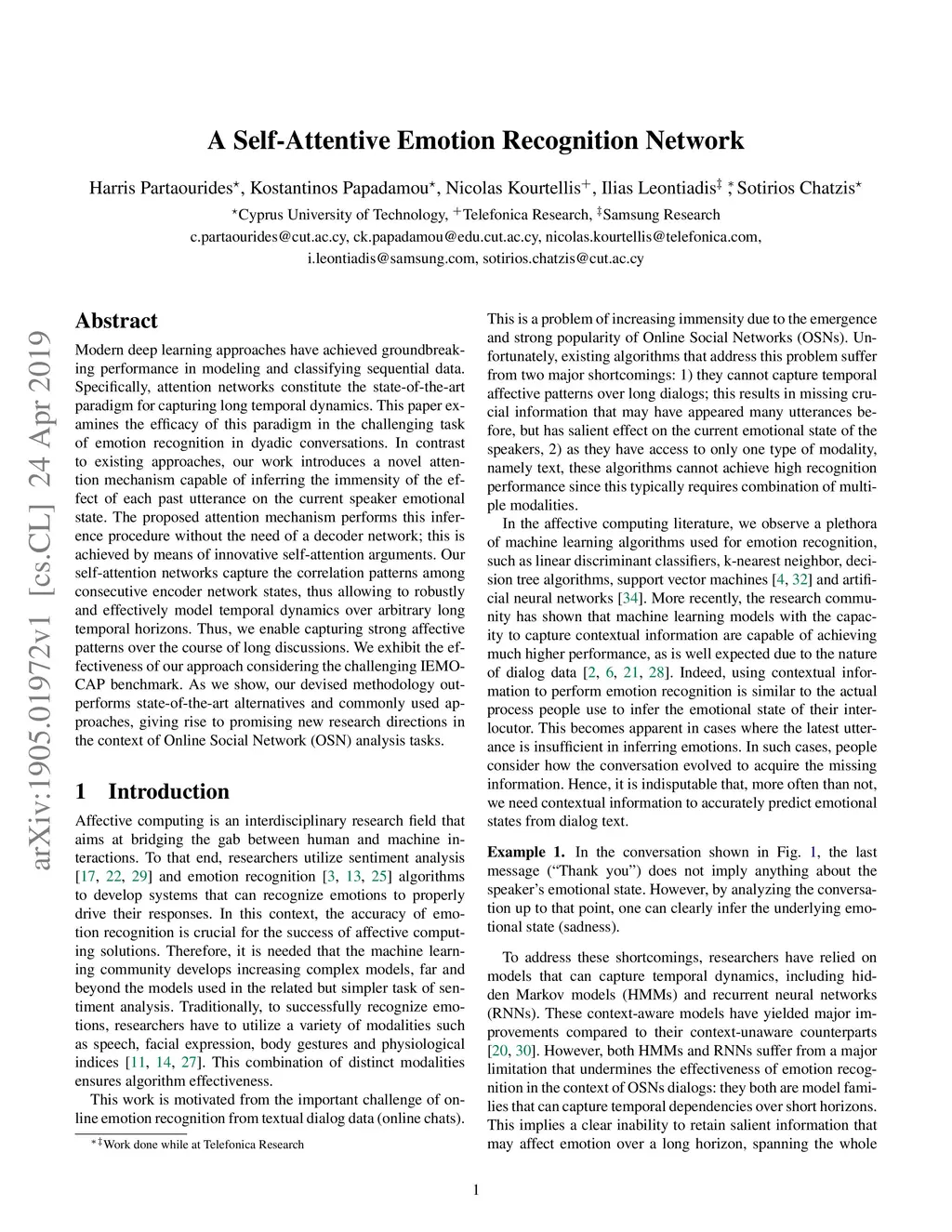 Modern deep learning approaches have achieved groundbreaking performance in modeling and classifying sequential data. Specifically, attention networks constitute the state-of-the-art paradigm for capturing long temporal dynamics. This paper examines the efficacy of this paradigm in the challenging task of emotion recognition in dyadic conversations. In contrast to existing approaches, our work introduces a novel attention mechanism capable of inferring the immensity of the effect of each past utterance on the current speaker emotional state. The proposed attention mechanism performs this inference procedure without the need of a decoder network; this is achieved by means of innovative self-attention arguments. Our self-attention networks capture the correlation patterns among consecutive encoder network states, thus allowing to robustly and effectively model temporal dynamics over arbitrary long temporal horizons. Thus, we enable capturing strong affective patterns over the course of long discussions. We exhibit the effectiveness of our approach considering the challenging IEMOCAP benchmark. As we show, our devised methodology outperforms state-of-the-art alternatives and commonly used approaches, giving rise to promising new research directions in the context of Online Social Network (OSN) analysis tasks.