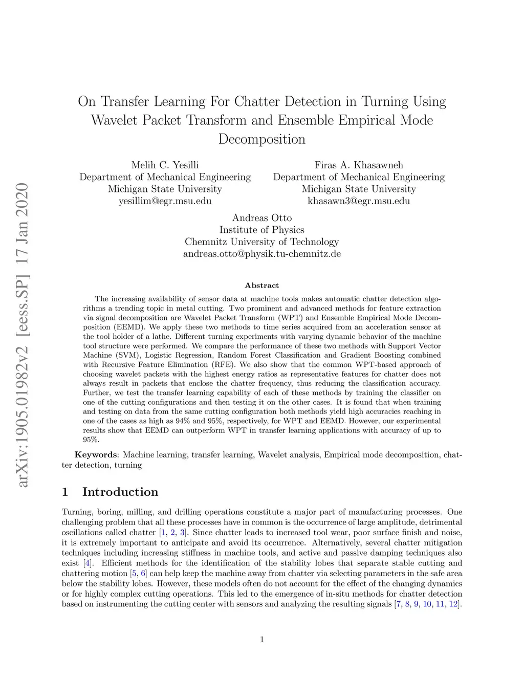 The increasing availability of sensor data at machine tools makes automatic chatter detection algorithms a trending topic in metal cutting. Two prominent and advanced methods for feature extraction via signal decomposition are Wavelet Packet Transform (WPT) and Ensemble Empirical Mode Decomposition (EEMD). We apply these two methods to time series acquired from an acceleration sensor at the tool holder of a lathe. Different turning experiments with varying dynamic behavior of the machine tool structure were performed. We compare the performance of these two methods with Support Vector Machine (SVM), Logistic Regression, Random Forest Classification and Gradient Boosting combined with Recursive Feature Elimination (RFE). We also show that the common WPT-based approach of choosing wavelet packets with the highest energy ratios as representative features for chatter does not always result in packets that enclose the chatter frequency, thus reducing the classification accuracy. Further, we test the transfer learning capability of each of these methods by training the classifier on one of the cutting configurations and then testing it on the other cases. It is found that when training and testing on data from the same cutting configuration both methods yield high accuracies reaching in one of the cases as high as 94% and 95%, respectively, for WPT and EEMD. However, our experimental results show that EEMD can outperform WPT in transfer learning applications with accuracy of up to 95%.