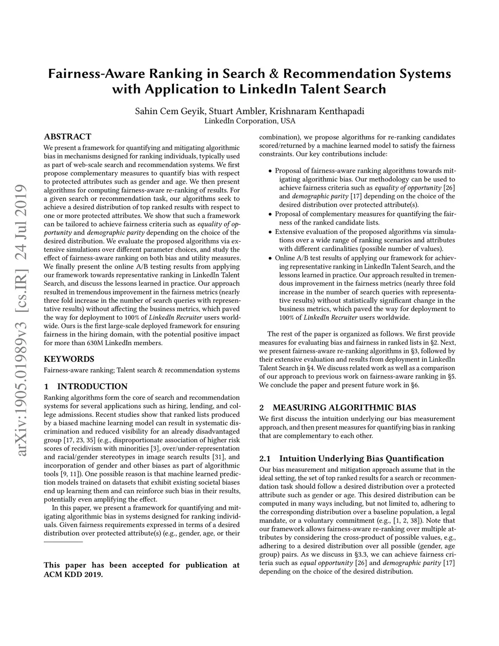 We present a framework for quantifying and mitigating algorithmic bias in mechanisms designed for ranking individuals, typically used as part of web-scale search and recommendation systems. We first propose complementary measures to quantify bias with respect to protected attributes such as gender and age. We then present algorithms for computing fairness-aware re-ranking of results. For a given search or recommendation task, our algorithms seek to achieve a desired distribution of top ranked results with respect to one or more protected attributes. We show that such a framework can be tailored to achieve fairness criteria such as equality of opportunity and demographic parity depending on the choice of the desired distribution. We evaluate the proposed algorithms via extensive simulations over different parameter choices, and study the effect of fairness-aware ranking on both bias and utility measures. We finally present the online A/B testing results from applying our framework towards representative ranking in LinkedIn Talent Search, and discuss the lessons learned in practice. Our approach resulted in tremendous improvement in the fairness metrics (nearly three fold increase in the number of search queries with representative results) without affecting the business metrics, which paved the way for deployment to 100% of LinkedIn Recruiter users worldwide. Ours is the first large-scale deployed framework for ensuring fairness in the hiring domain, with the potential positive impact for more than 630M LinkedIn members.